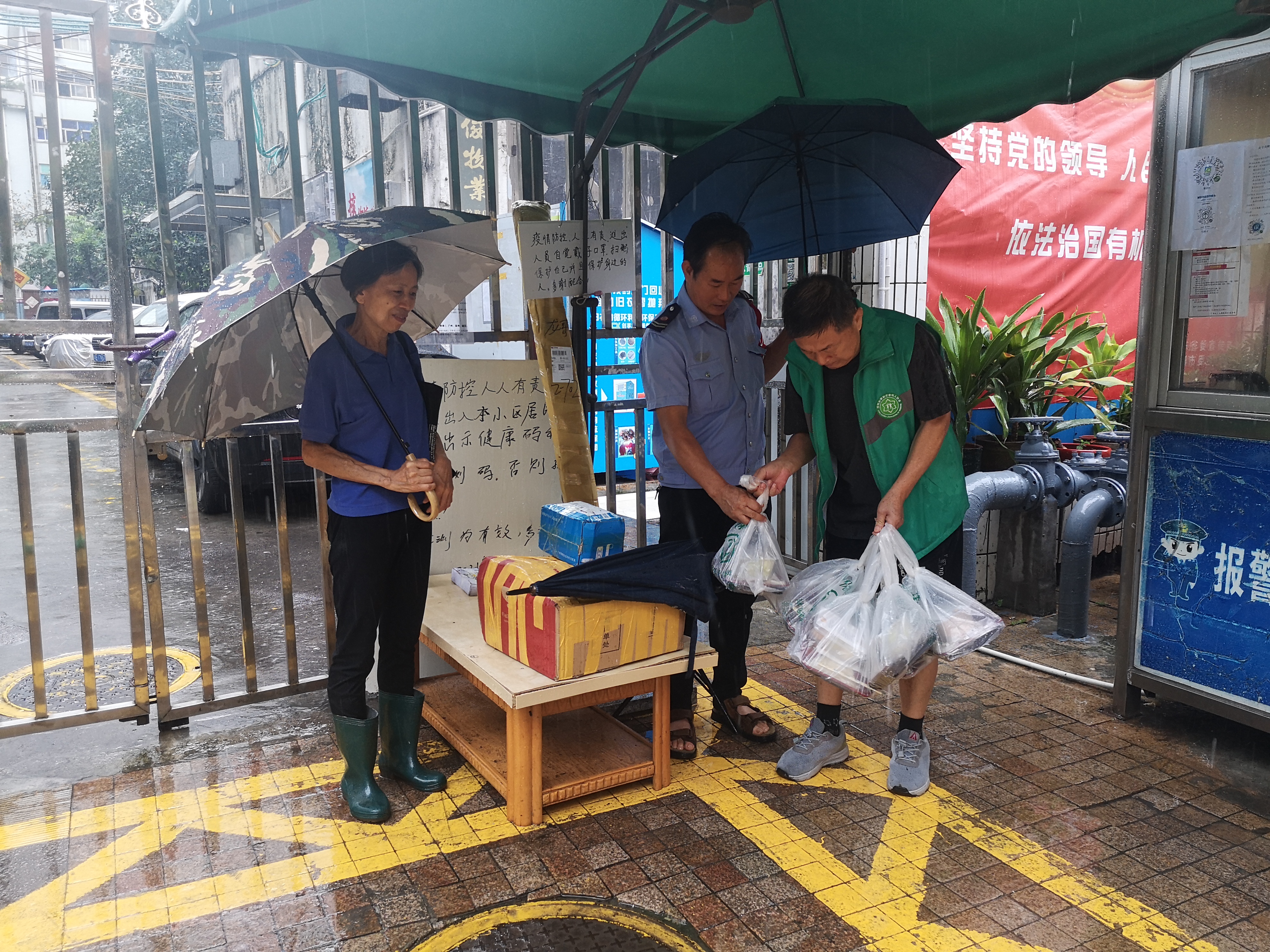 老年志愿者和社工在现场派送午餐完毕后,将现场认领素食午餐,分组进入各住宅小区,送给值班的保安员,挨家挨户派送到高龄长者的家中。有位长者感动地说:“下这么大的雨还送来饭盒,真的太感谢你们了”。领取了免费素食午餐的长者纷纷表示感谢爱心餐饮企业的善举,感谢嘉南社区党委和老年人协会的爱心接力。