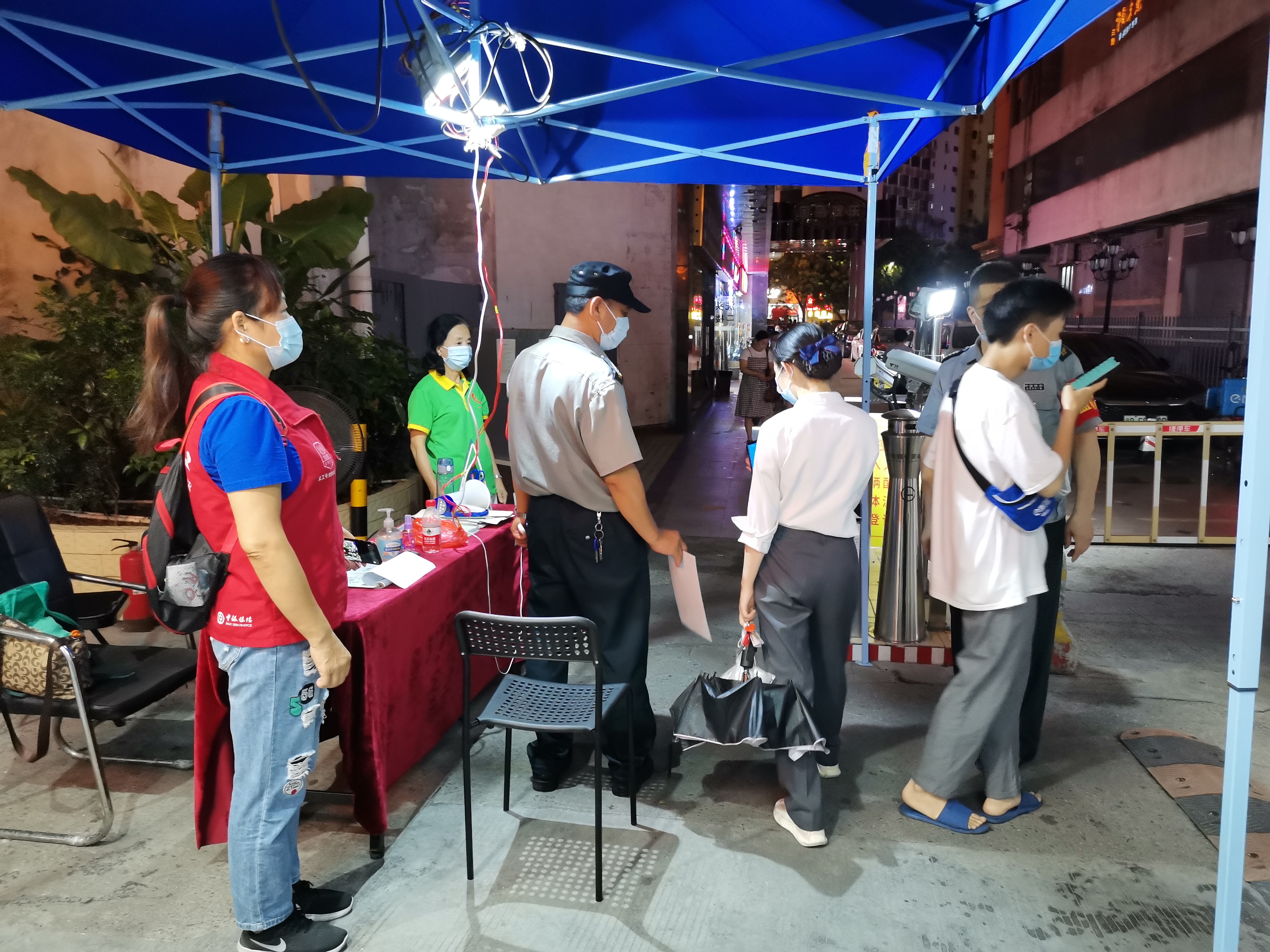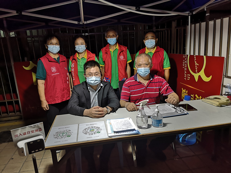 嘉南社区老年人组织近10名老年志愿者参与社区党委部署的疫情防控工作,在广西外贸大院、阳光楼、凯利宿舍协助物业公司保安员为外来人员测体温、查验行程码、健康码等工作。