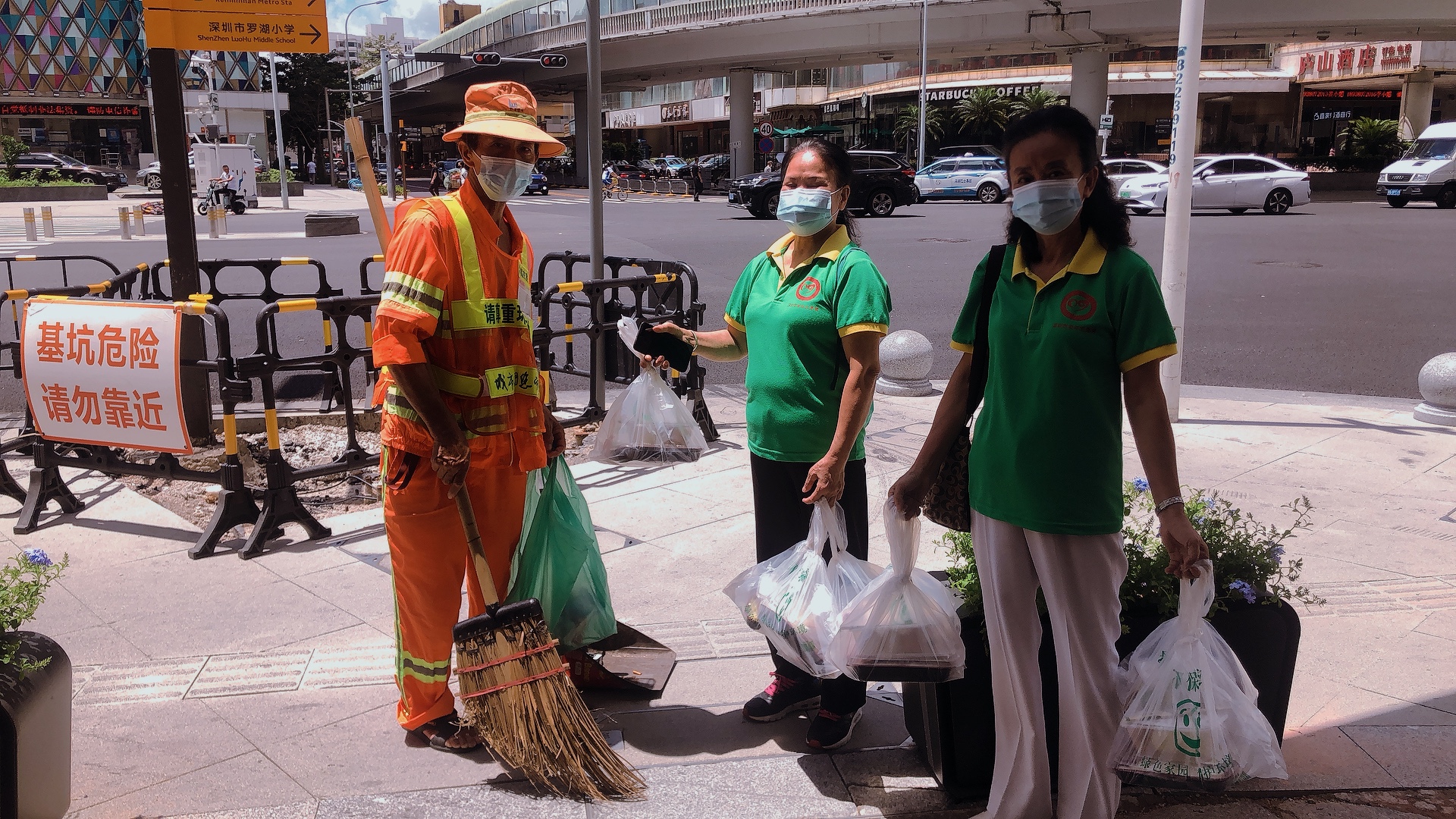 在派送点现场,社工和老年志愿者分工合作,有的悬挂宣传横幅,有的配合酒楼员工搭配饭盒和包点,有的维持派送现场秩序。整个派送现场温馨和谐、秩序井然,近200份饭盒很快被环卫工人、快递员、装修工人、的士司机等社会上有需要人士认领。