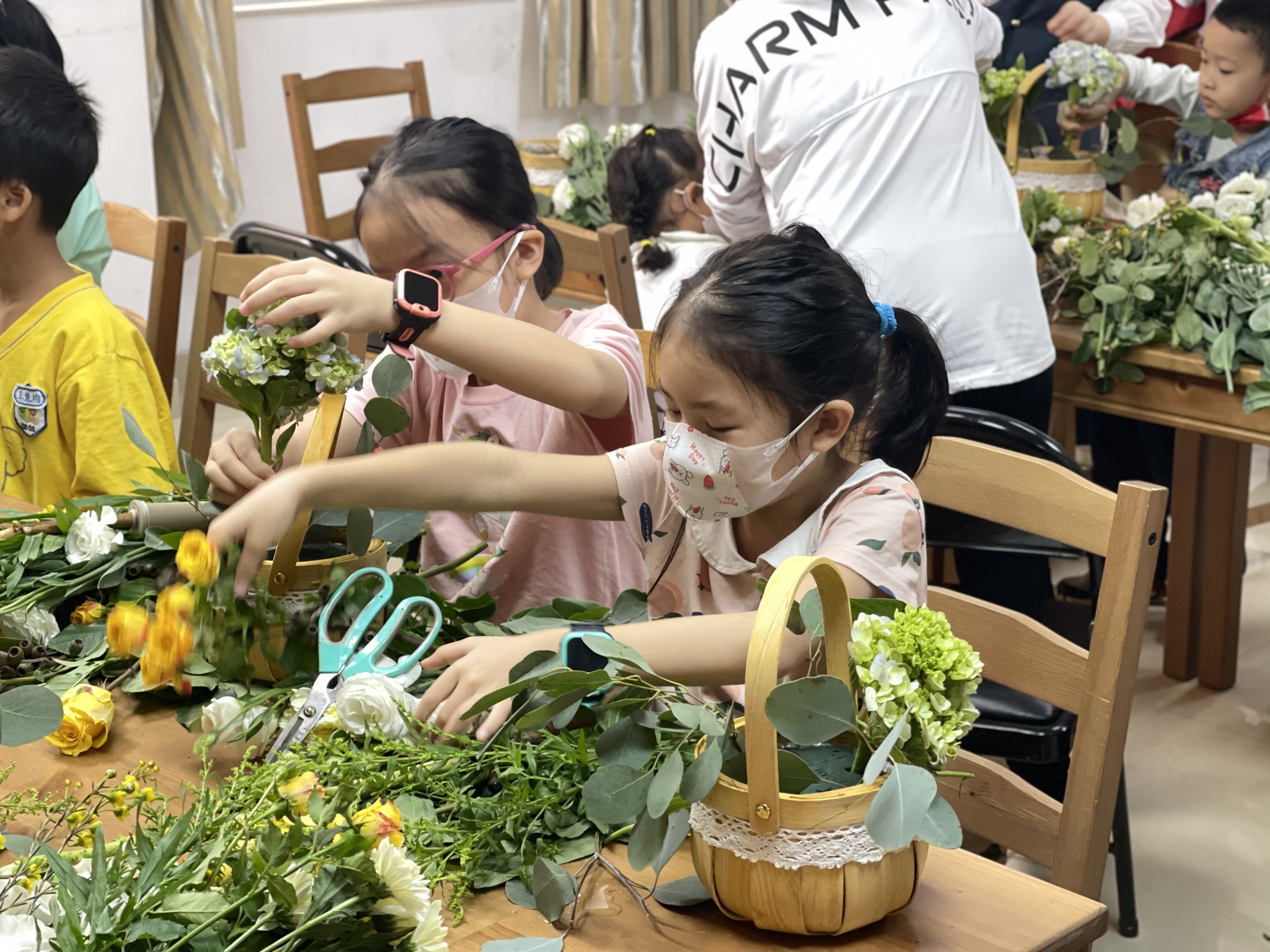 罗湖家园网讯:嘉南社区新时代文明实践站开展“同心”巧手插花献给党活动,活动现场气氛温馨,社区特意邀请了有丰富经验的花艺老师给队员们讲授选花、颜色搭配、造型等方面的插花技巧。整个插花过程中,大人和小朋友们都无比专注。大家在老师的指导下,跟着节奏,一边认真听取讲解,一边对自己手中的花材进行修剪、搭配、造型,互相交流,一步一步创作自己的插花作品。经过一个多小时的创作,一篮篮层次分明、错落有致的插花作品“新鲜出炉”。