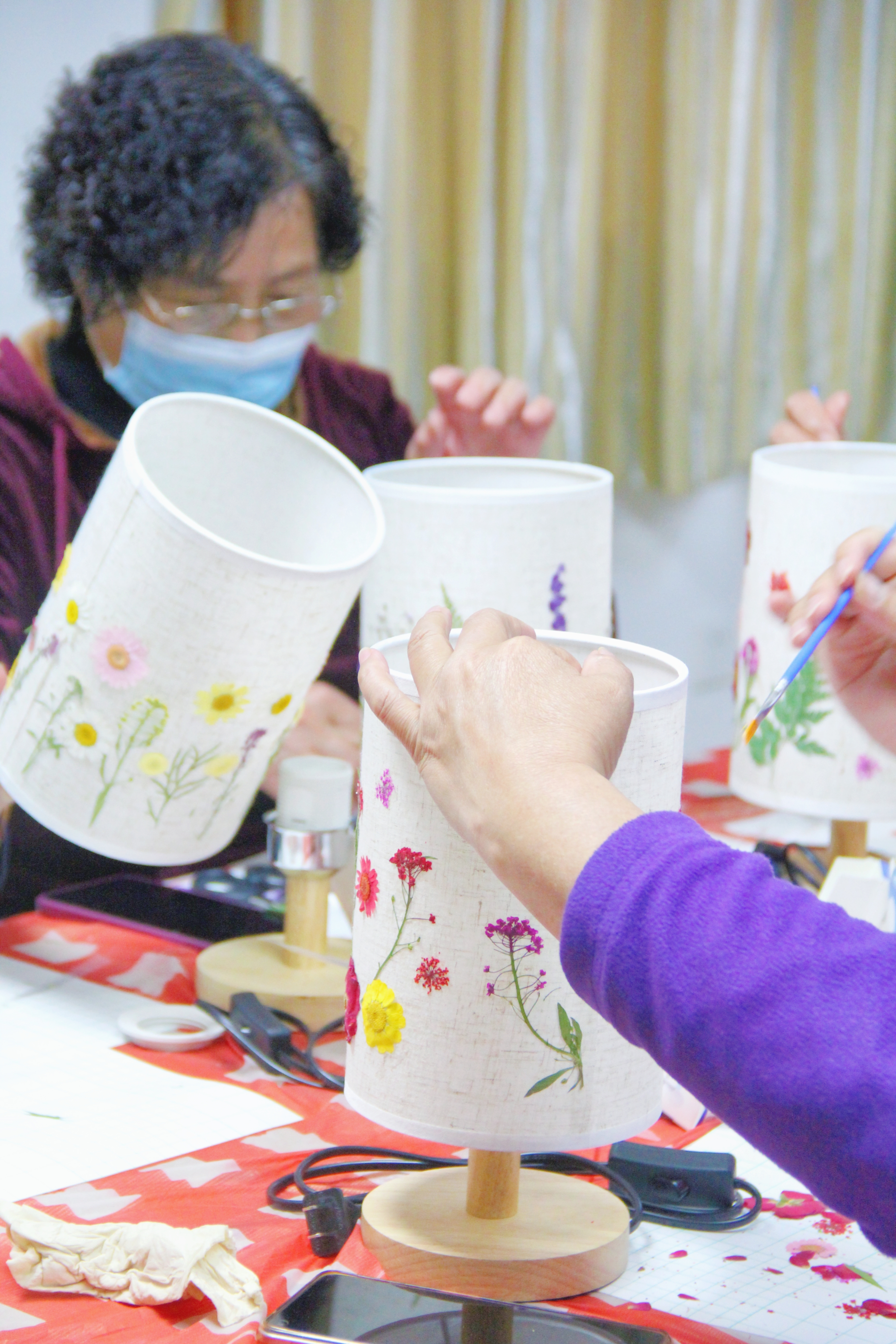 活动开始首先由手工老师向各位参加活动的居民讲述了本次手工活动的注意事项、操作方式及设计要点,随后大家便发挥想象力及创造力,开始了自由创作。原本素雅暗淡的小台灯在大家的创作下顿时变得五彩缤纷,各式各样的花材叶材在台灯布上绽放添彩。