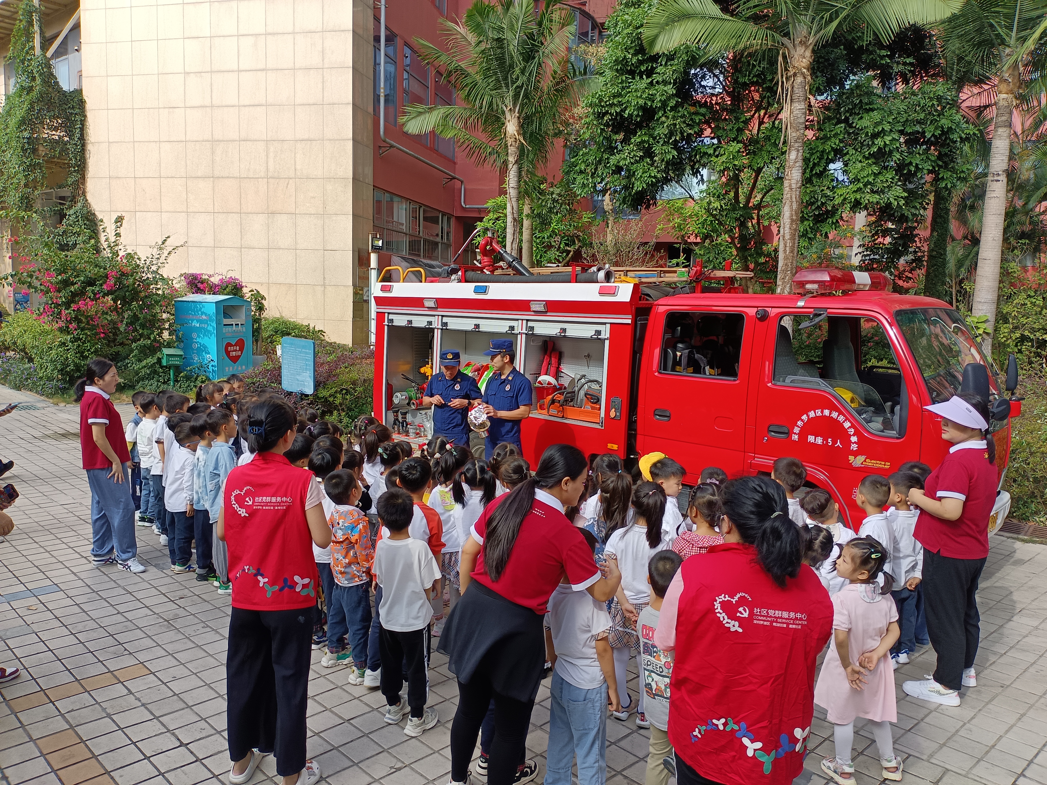 此次活动共分为消防科普、消防器材演示、参观消防车等多个环节。消防员现场为小朋友们及老师们讲解了消防科普知识,把如何正确使用灭火器及防毒面罩的方法演示给小朋友们。小朋友都非常认真的观看了消防员叔叔的演示,最后在消防员和社工的带领下组织小朋友参观消防车,小朋友们都感到有趣和新奇,在他们幼小的心灵中种下一颗安全的种子。