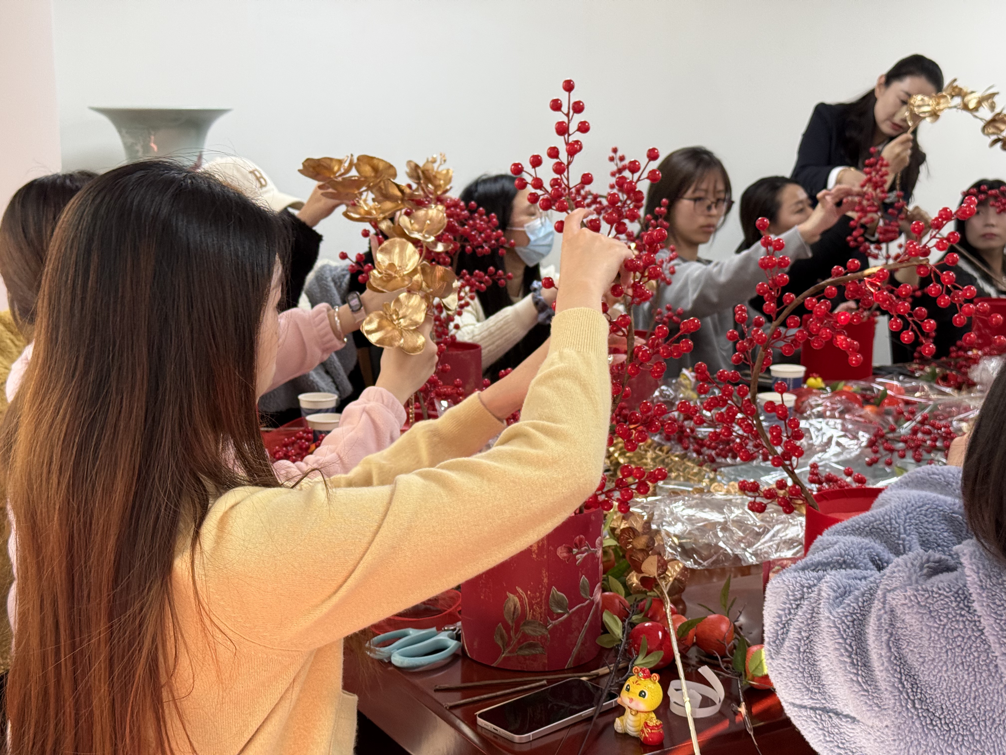 参与活动的职工们热情高涨,纷纷发挥自己的创造力与想象力。大家相互交流、互相帮助,将原本单调的材料组合成了一个个饱含新春祝福与美好愿景的福桶,用丝带精心编织独特造型,为福桶增添了创意与个性。