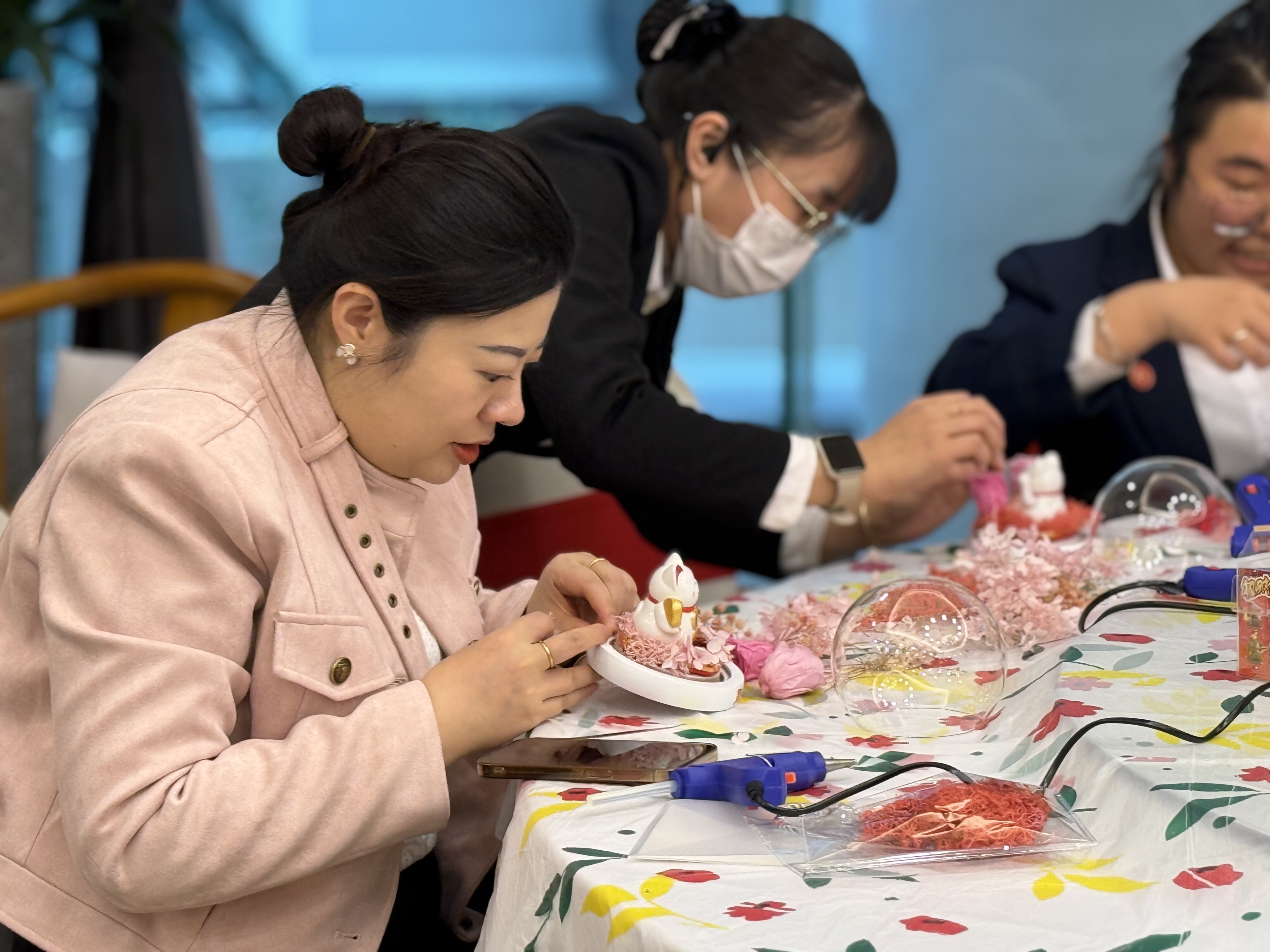 职工们全神贯注地聆听,随后迫不及待地投入到创作中。大家充分发挥自己的想象力与创造力,精心构思着每一个细节。有的职工巧妙地运用不同颜色的永生花,为招财猫打造出绚丽多彩的“外衣”;有的则在招财猫周边点缀上小巧的装饰,使其更具灵动性与趣味性。大家相互交流、分享经验,遇到问题时,彼此热情地伸出援手,现场洋溢着浓厚的团队协作氛围。