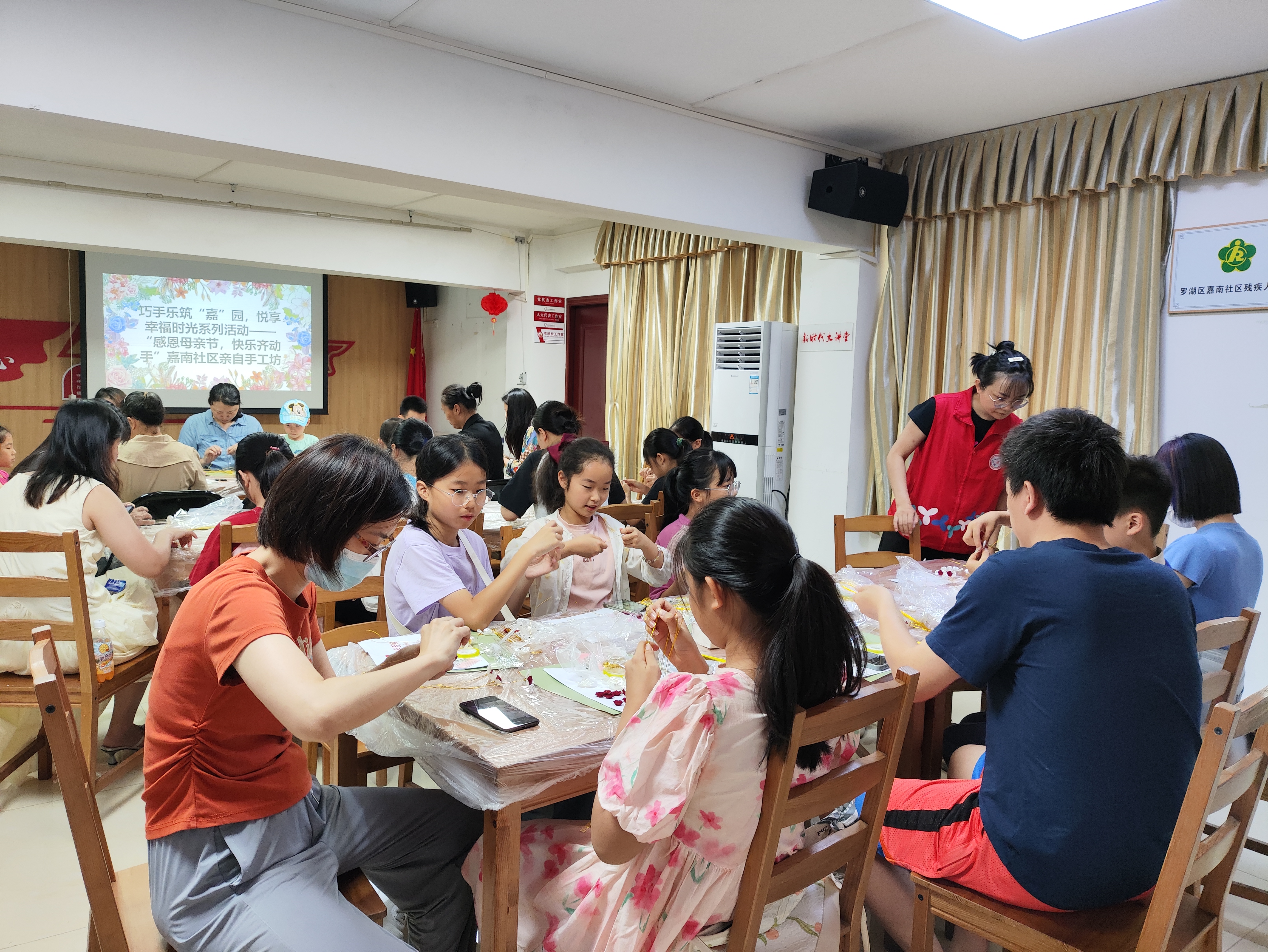 罗湖家园网讯:为弘扬孝亲文化,增进亲子情感,5月10日上午,嘉南社区 “巧手乐筑‘嘉’园,悦享幸福时光” 系列活动之 “感恩母亲节 快乐齐动手” 亲子手工坊在嘉南社区党群服务中心活动室温馨开启,16 对亲子共同参与玫瑰花束 DIY,用双手传递对母亲的爱。