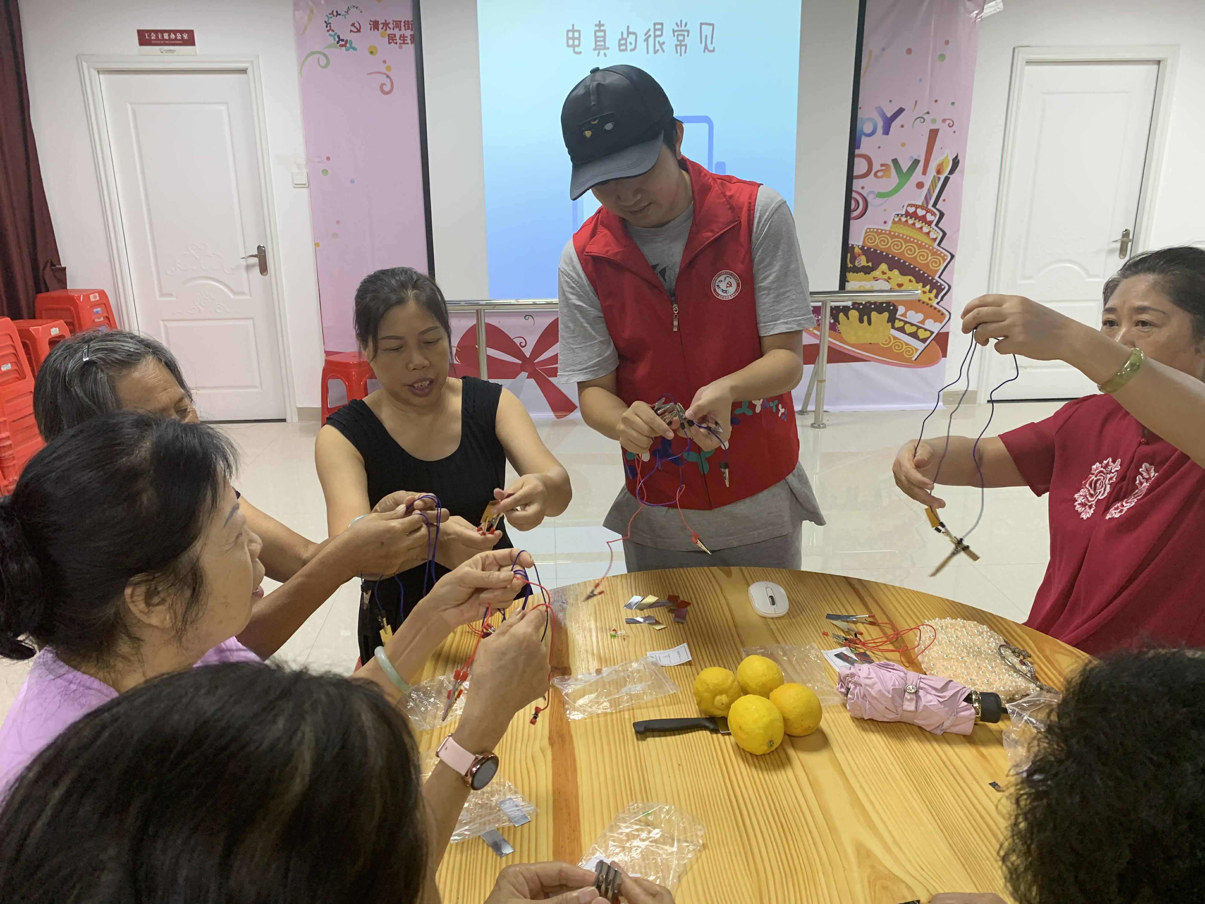本节小组的主题为“电”,在实验制作开始前,工作人员为大家介绍今天的实验,接下来的实验过程中,工作人员为大家详细的讲解每一个步骤。