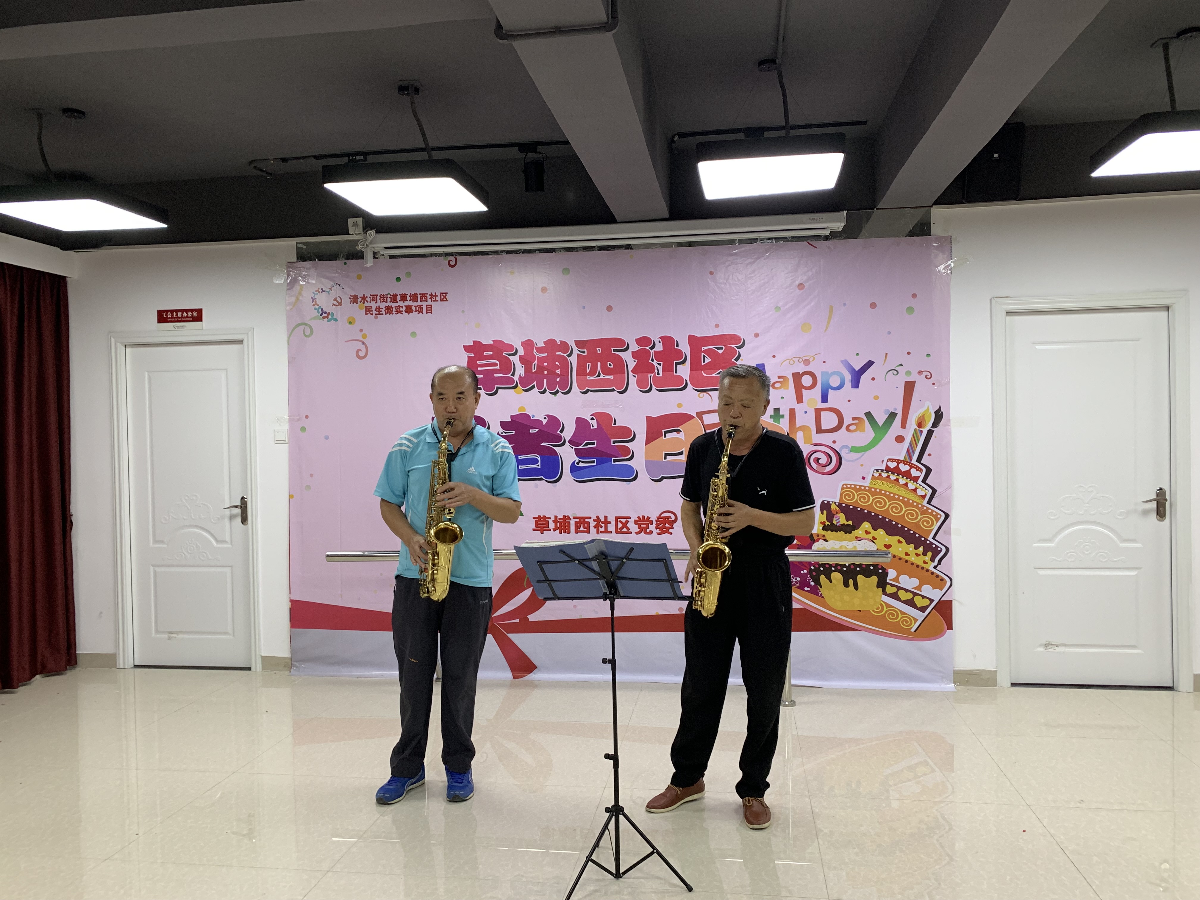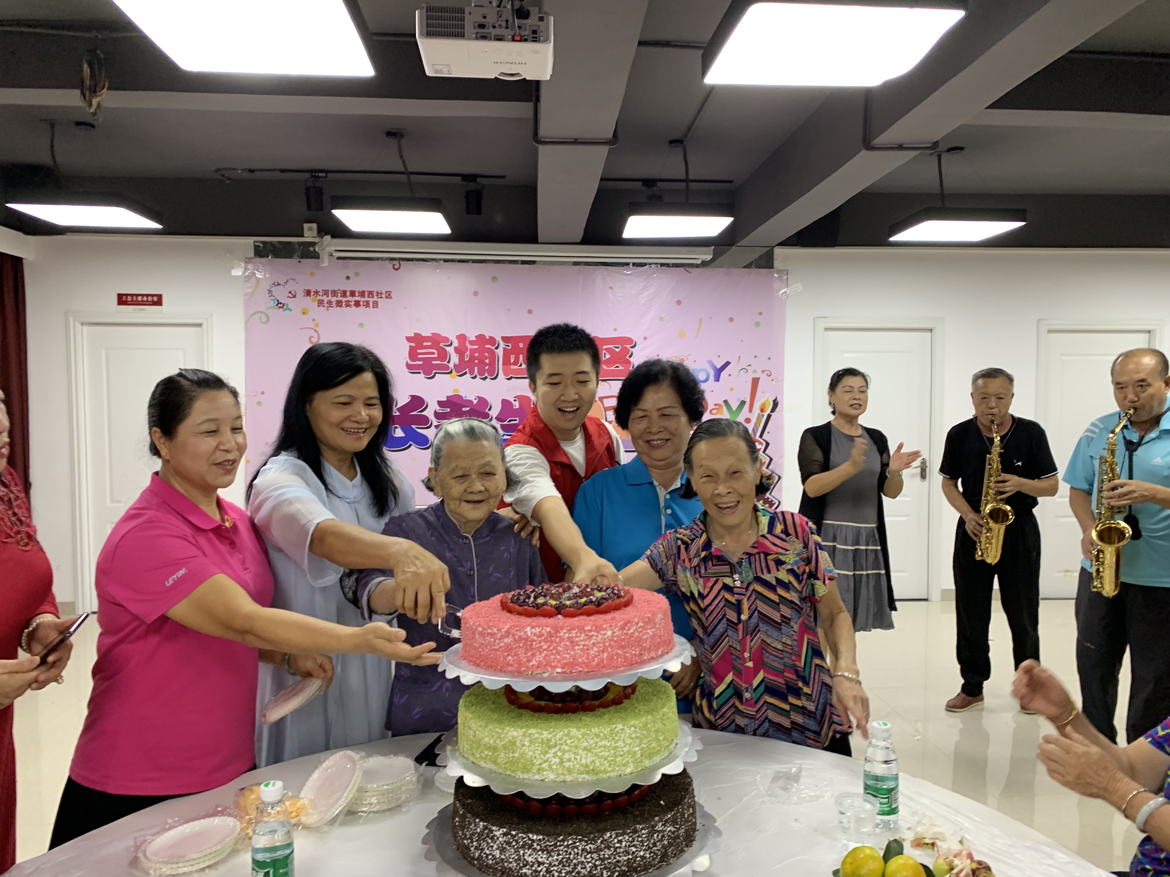 活动开始由草埔西社区党委副书记、居委会副主任、老年人协会会长蓝远香同志请出最年长的寿星一起切蛋糕,大家在萨克斯队员带动下唱祝您生日快乐歌,大家一边吃蛋糕,一边欣赏由老年人协会舞蹈队带来的和萨克斯风队伍带来萨克斯风演奏和独唱歌曲等节目。长者们一个个听得回味无穷,看的津津有味,表演赢得长者们阵阵掌声和欢呼声,更有长者们主动献唱经典歌曲把现场气氛推至最高。