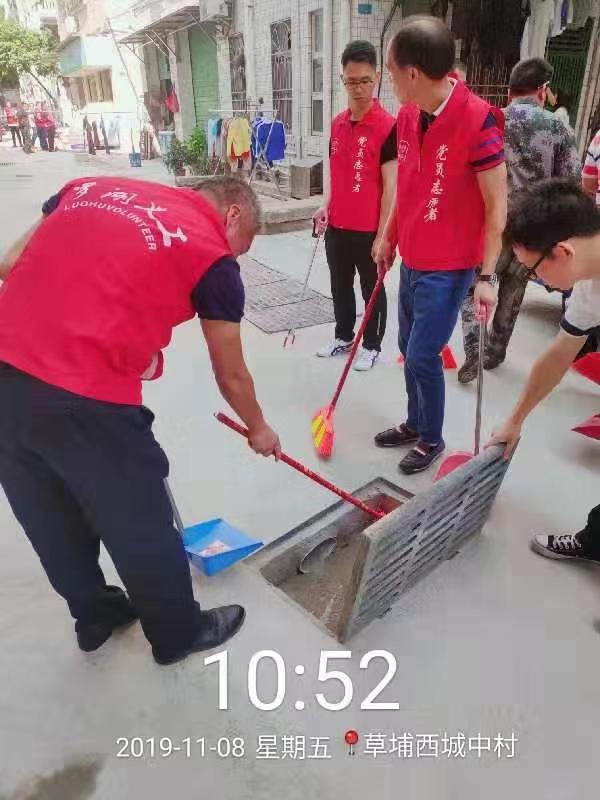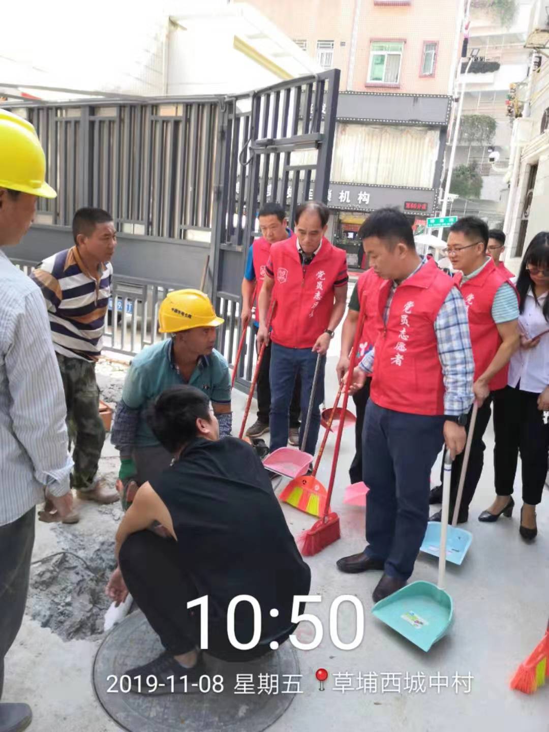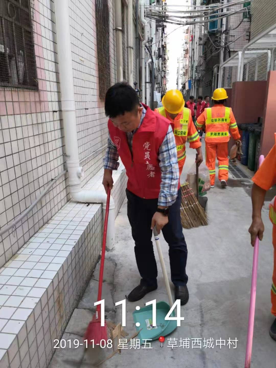 为继续做好第六届文明城市创建、市容市貌环境卫生工作,,11月8日,清水河街道办事处调研员敖卓海,办事处副主任戴雁、刘思源,副调研员吴剑霖组织草埔西社区各支部党员志愿者、工作站工作人员、草埔西社区城中村物业公司工作人员、草埔西社区老人协会在草埔西社区继续开展“周五”城中村清扫行动。
