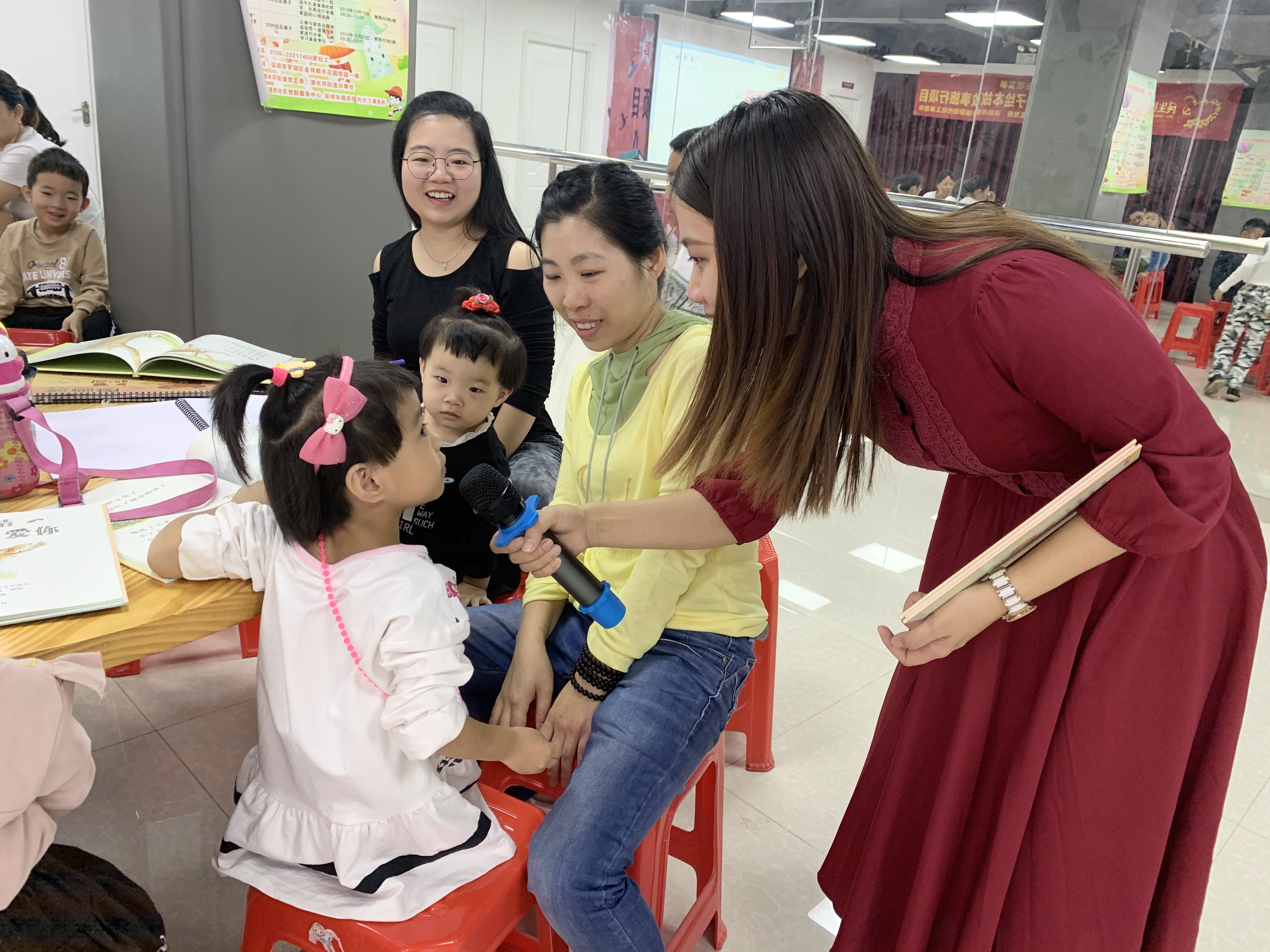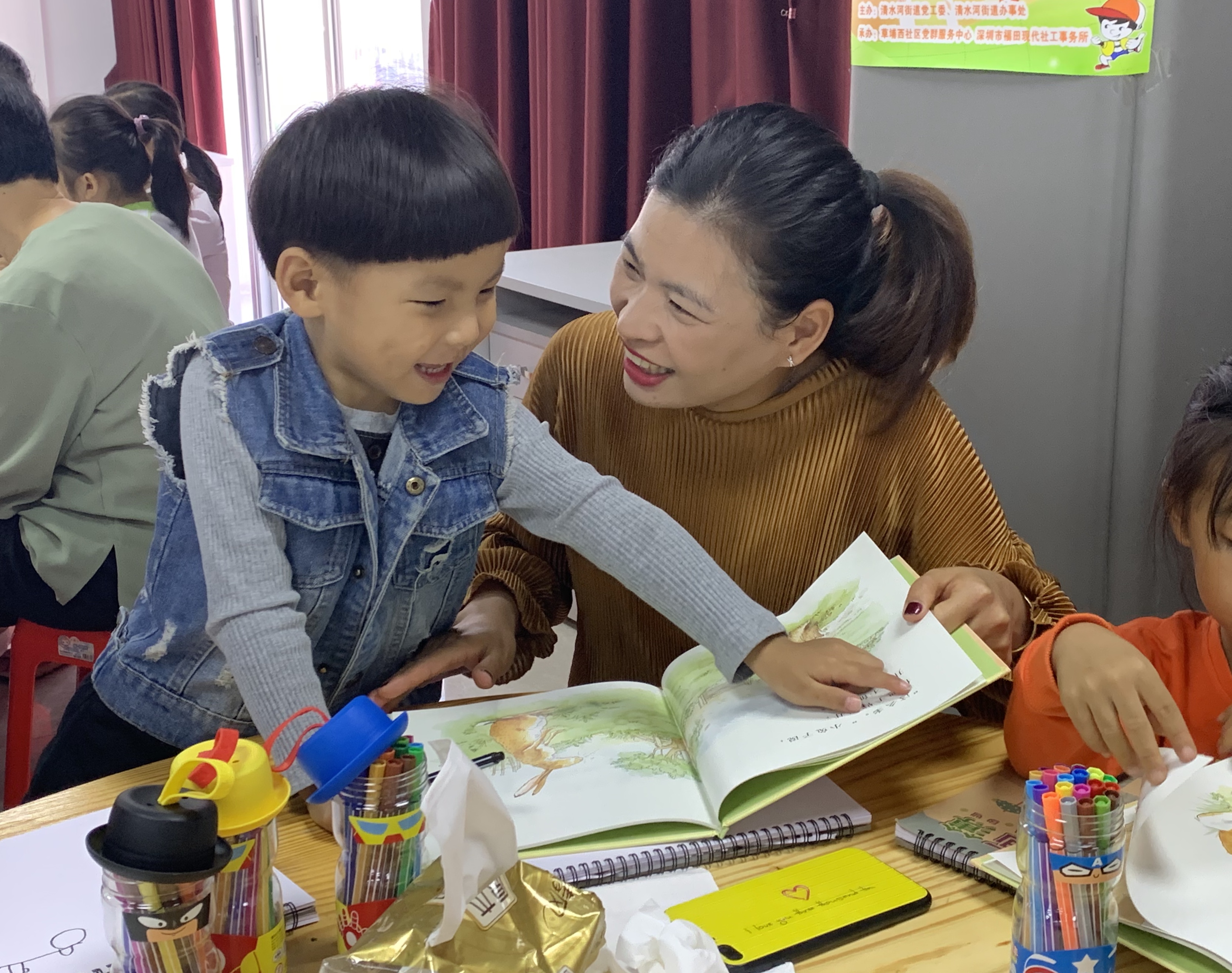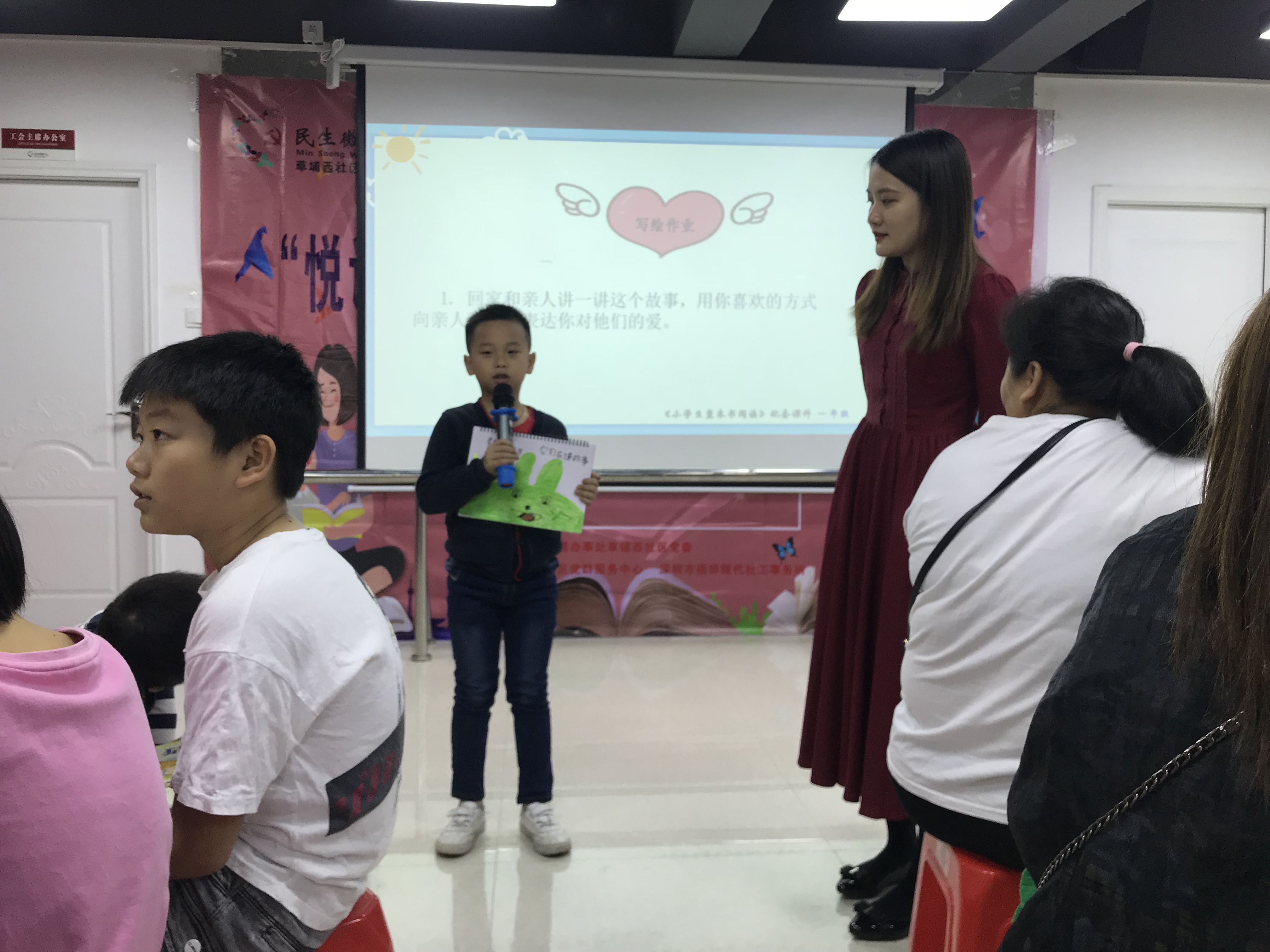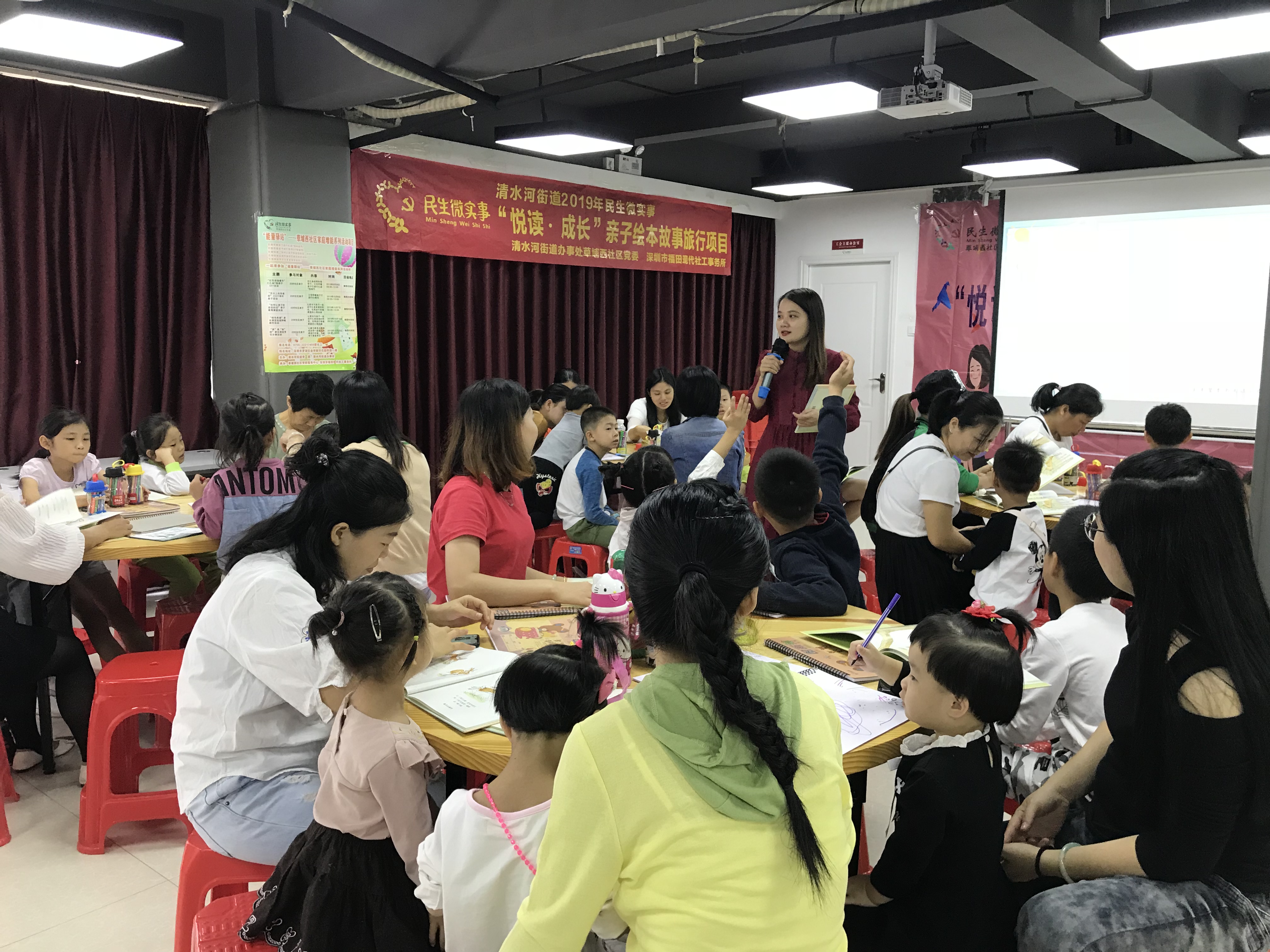 2019年11月9日上午,草埔西社区党委在鹤围村2栋3楼开展“悦读 ●成长”亲子绘本故事旅行项目之第五场培养温馨亲情亲子阅读故事会,现场邀请了深圳市小学语文老师梁老师进行授课,共吸引了辖区内40名亲子前来参与。