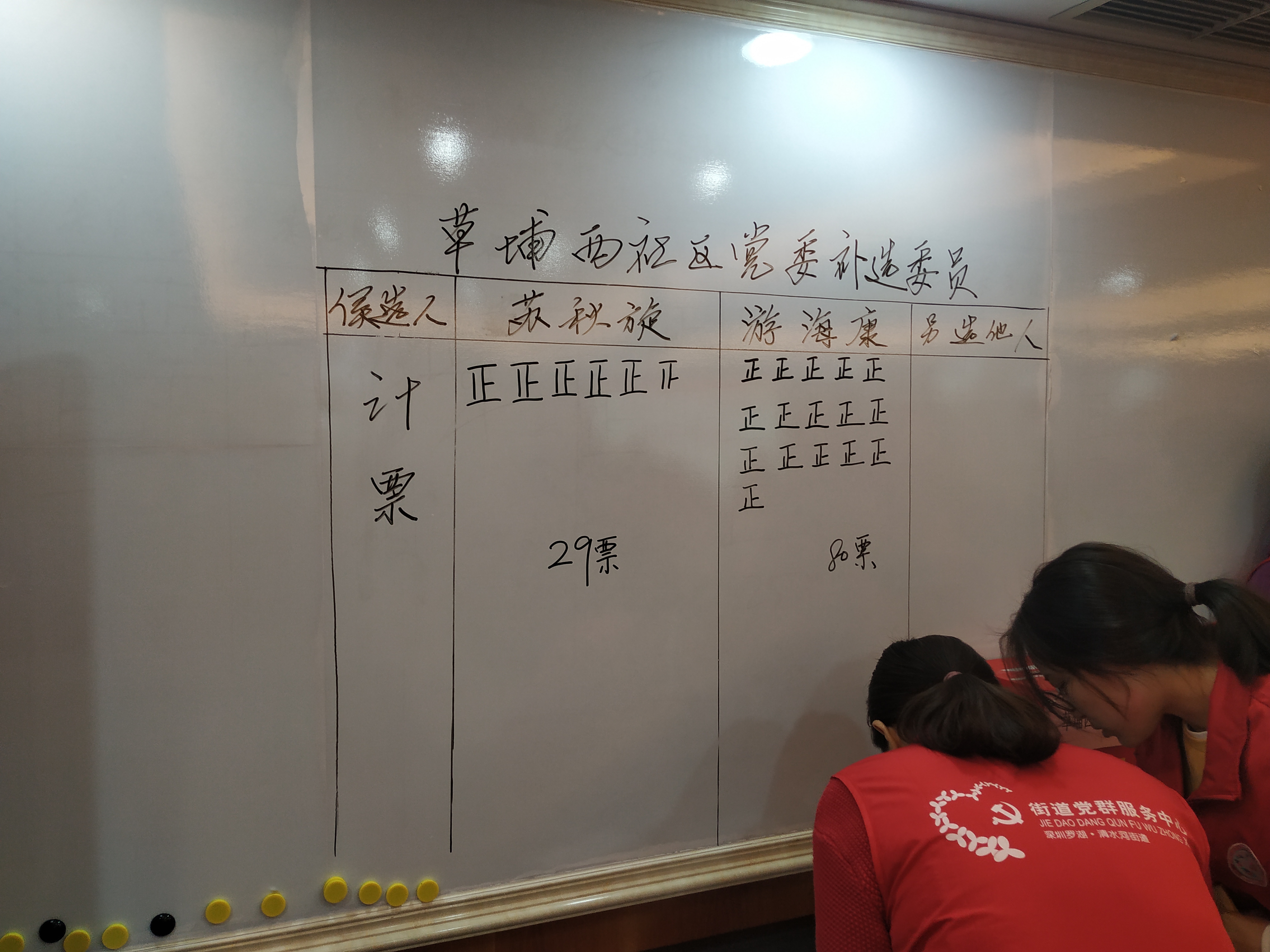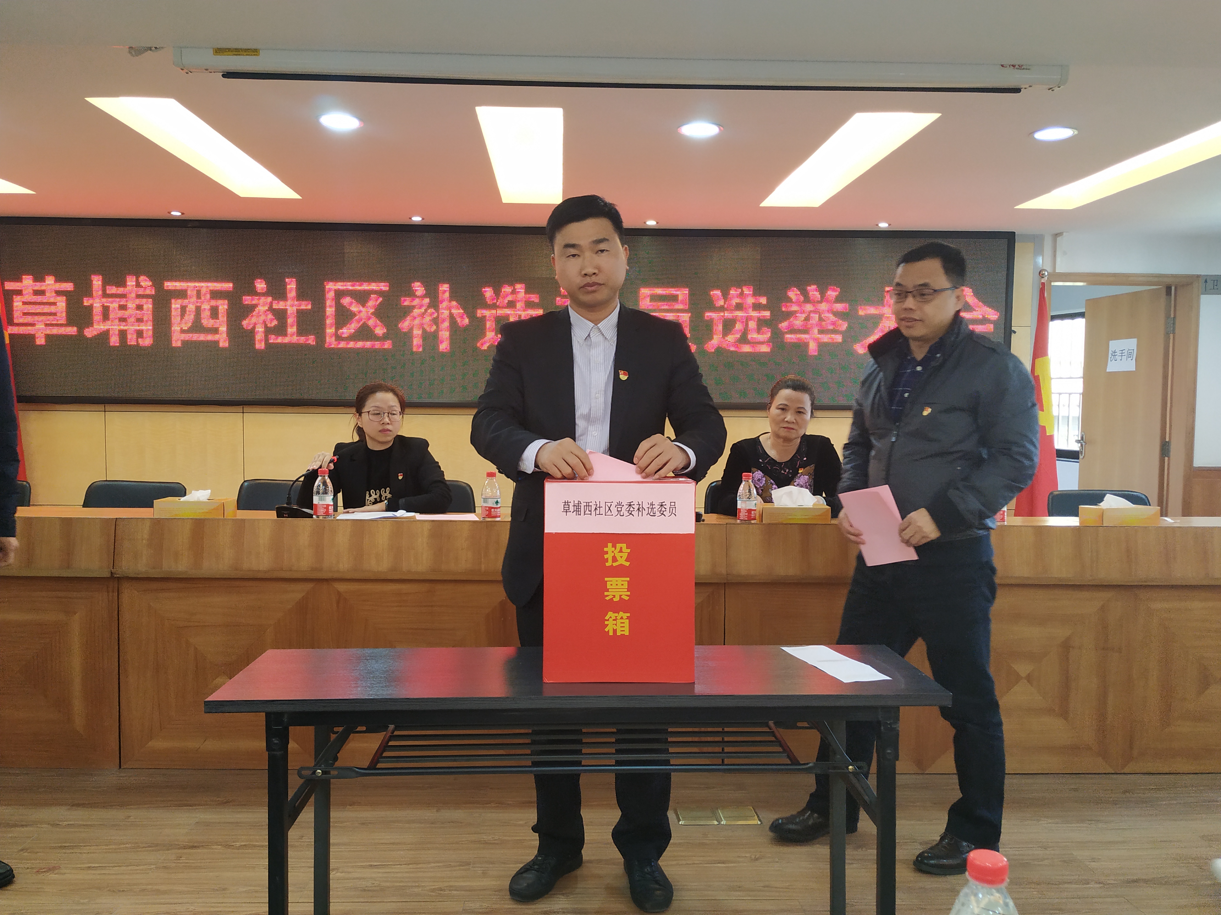 大会由草埔西社区党委专职副书记张佩芬主持,严格按照组织程序和选举流程进行。草埔西社区党委书记邓新锋分别宣读了罗清委【2019】43号《中共深圳市罗湖区清水河街道工作委员会文件》和罗清委【2019】33号《中共深圳市罗湖区清水河街道工作委员会文件》。会议首先通过了《选举办法》、监票人名单、计票人名单及候选人名单,随后现场通过无记名投票方式,差额补选产生1名社区党委委员游海康同志。全体党员表示祝贺,并希望社区党委班子要勇担当、敢作为,进一步强化基层治理。
