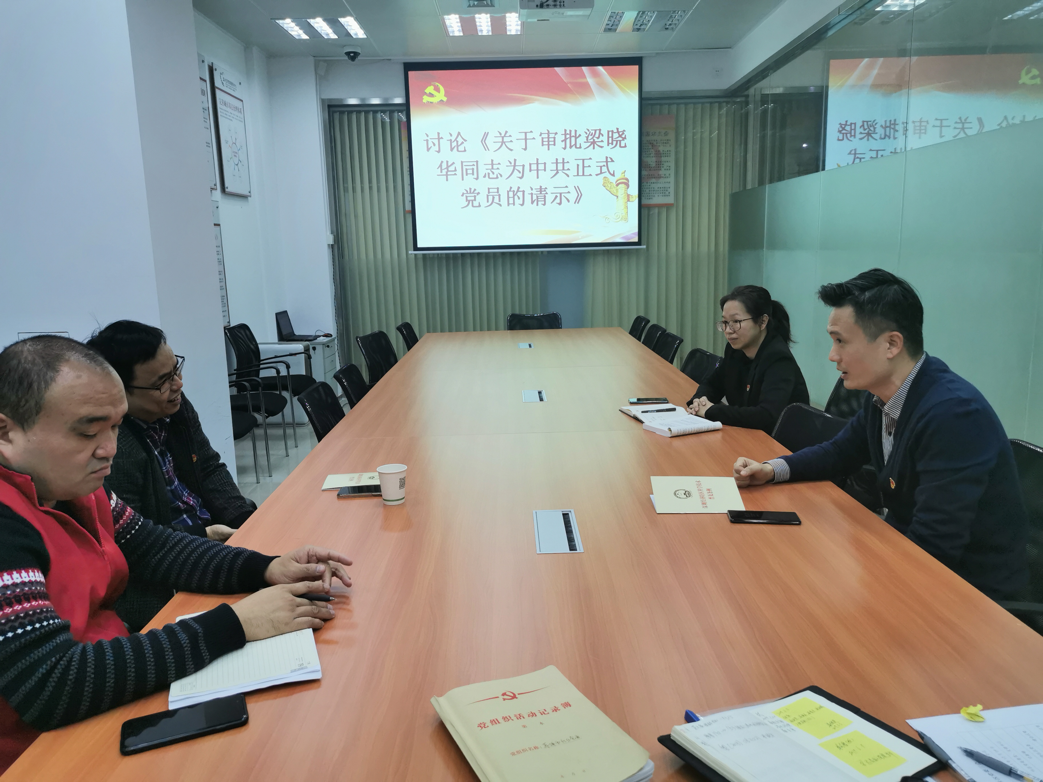 接着,党委会讨论了清水河党支部提交的《关于审批梁晓华同志为中共正式党员的请示》的情况,讨论了梁晓华同志入党问题。该同志自觉用党员标准严格要求自己,工作学习等方面都较为突出。经党委会讨论,认为梁晓华同志已具备中共正式党员条件,依据《中国共产党发展党员工作细则》,会议同意接收梁晓华同志为中共正式党员,并上报上级党委审核。