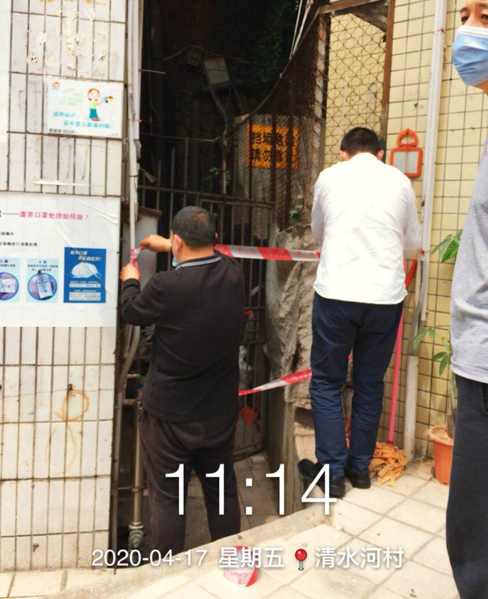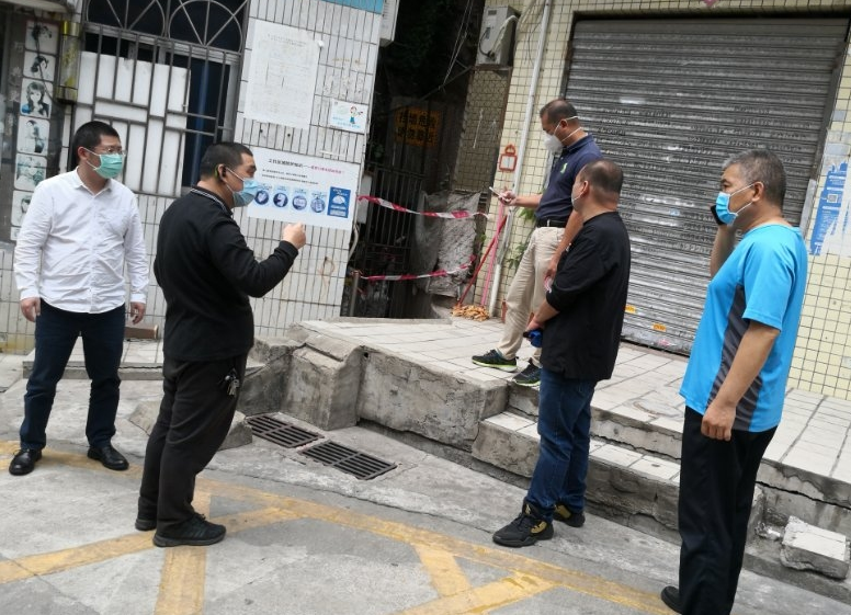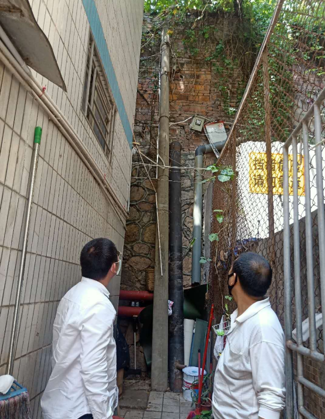 草埔西社区党群服务中心城管专干在巡查过程中发现位于清水河村公厕(清水河村48栋)后挡土墙变形且有裂痕,随即立即上报街道办事处三防办,随后,三防办领导蒲队长查看现场后立即安排该区域的警戒维护,提醒市民注意安全。