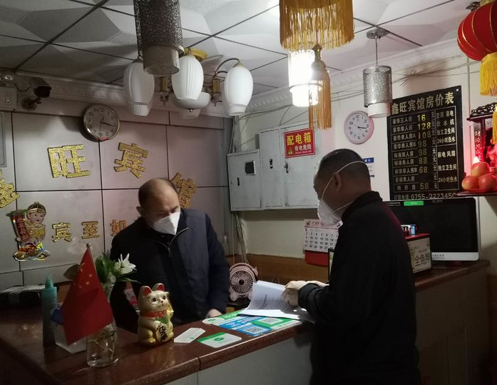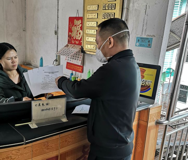 为有效开展防疫工作,草埔西社区党委工作人员到旅馆派送住宿业防控指引。