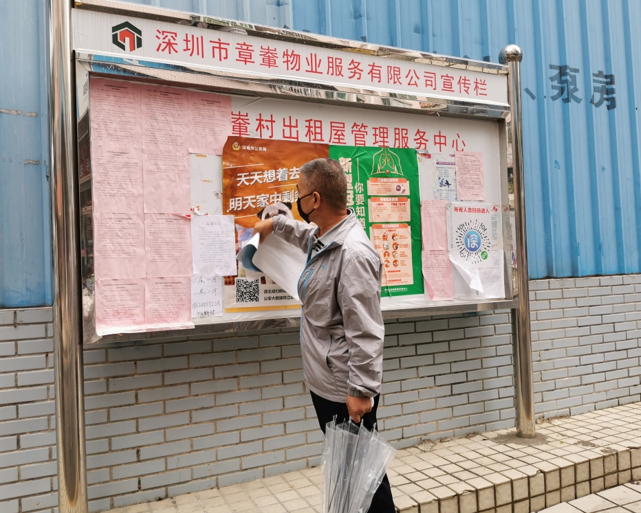 草埔西社区党委安排工作人员巡查社区张贴海报,整改辖区海报损坏现象。