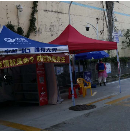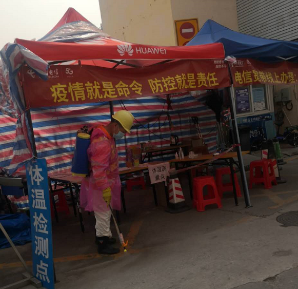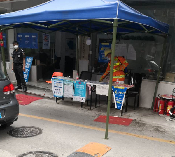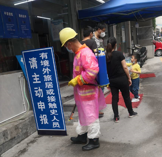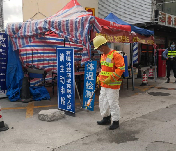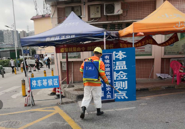 草埔西社区党委安排环卫公司疫情期间对社区体温检测点定期进行消毒,减少细菌传播