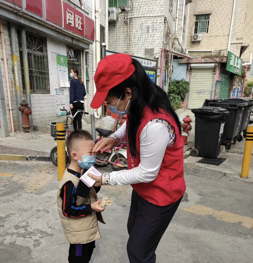 草埔西社区居委会蓝远香副主任为辖区内的小朋友戴上口罩,希望他们能够在此次疫情中做好自我防护。