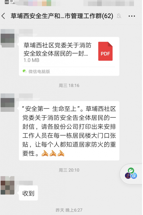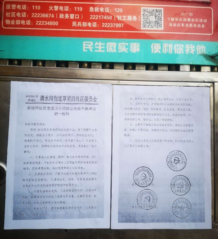 信中内容介绍到居民日常生活中面面所及的消防安全防范知识,工作人员通过转发微信业主群、居民群、朋友圈、在每栋居民楼楼梯口显眼处张贴宣传单页等方式,大力宣传推广,邀请社区居民共建安全社区。