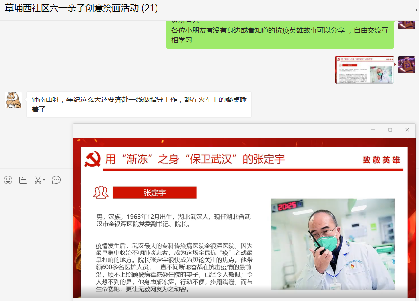 活动上,社区工作者通过参加者的作品、照片、文字的形式分享抗疫一线感人的故事,向逆行者们学习致敬。让同学们形成正确的人生观、价值观,激发他们的爱国热情。