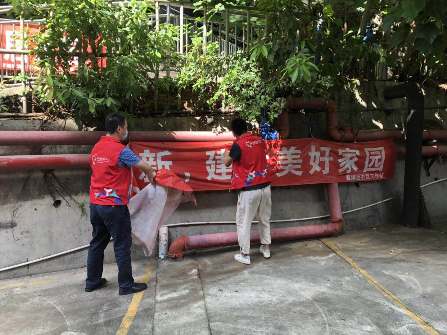 8月14日上午,草埔西社区党群服务中心工作人员开展辖区创文自查工作。在巡查过程中,发现有乱张贴,海报、横幅破损、歪斜情况,立即整改,扎实做好创文工作。