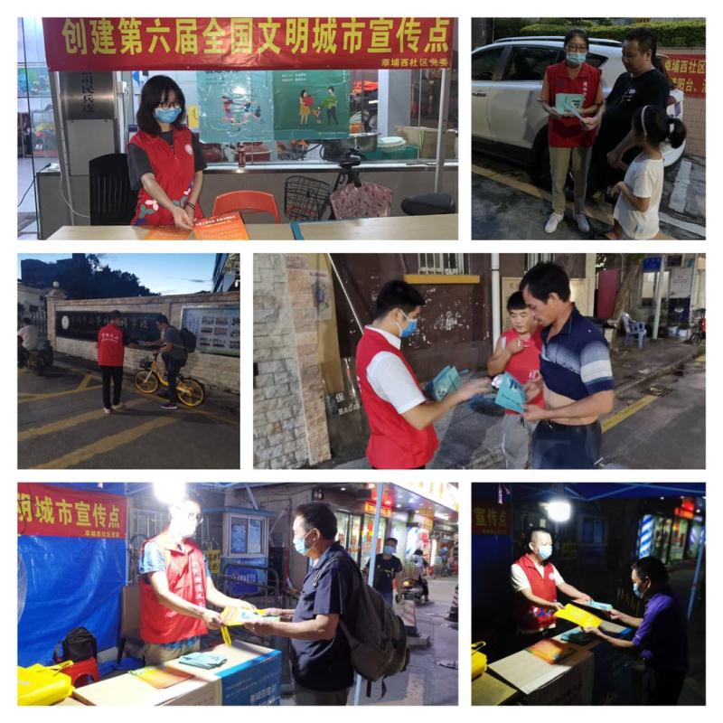 8月14日晚,草埔西社区防疫卡点开展创文宣传活动,草埔西社区工作人员与各股份公司党员和积极分子、志愿者依然坚守卡点,积极向进出卡点群众派发创文宣传资料。
