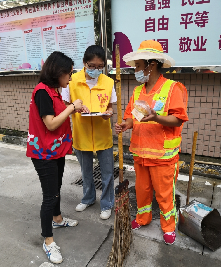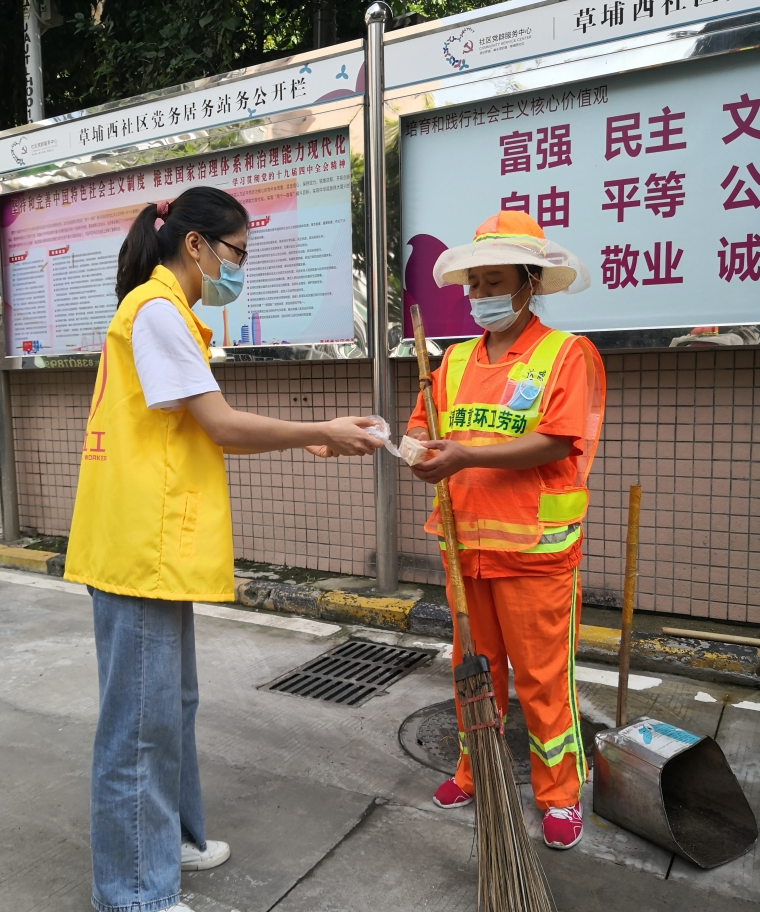 草埔西社区党群服务中心的服务范围是典型的城中村地区,这里有很多为生活而默默努力的人,即使生活过得艰辛,也会笑对生活。2020年8月16日上午,艳阳高照,草埔西社区的环卫工人正认真地打扫街道,她们不知正有一份小温暖,在为她们而准备着。深圳市社联社工服务中心的社工,为社区的环卫工人准备了爱心早餐,虽然数量不多,但也向默默为城市清洁做贡献的环卫工人传递了社工的一点心意。作为环卫工人的一份子,柴阿姨表示谢谢我们的早餐,也感谢社工能如此关心她们,她感觉到很温暖。此外,社工还认真向柴阿姨询问了个人信息,以及当前存在的困难和希望获得的帮助等,了解环卫工人们的服务需求,为后期开展活动提供了数据支持,也为开展针对性的服务提供了计划方向。