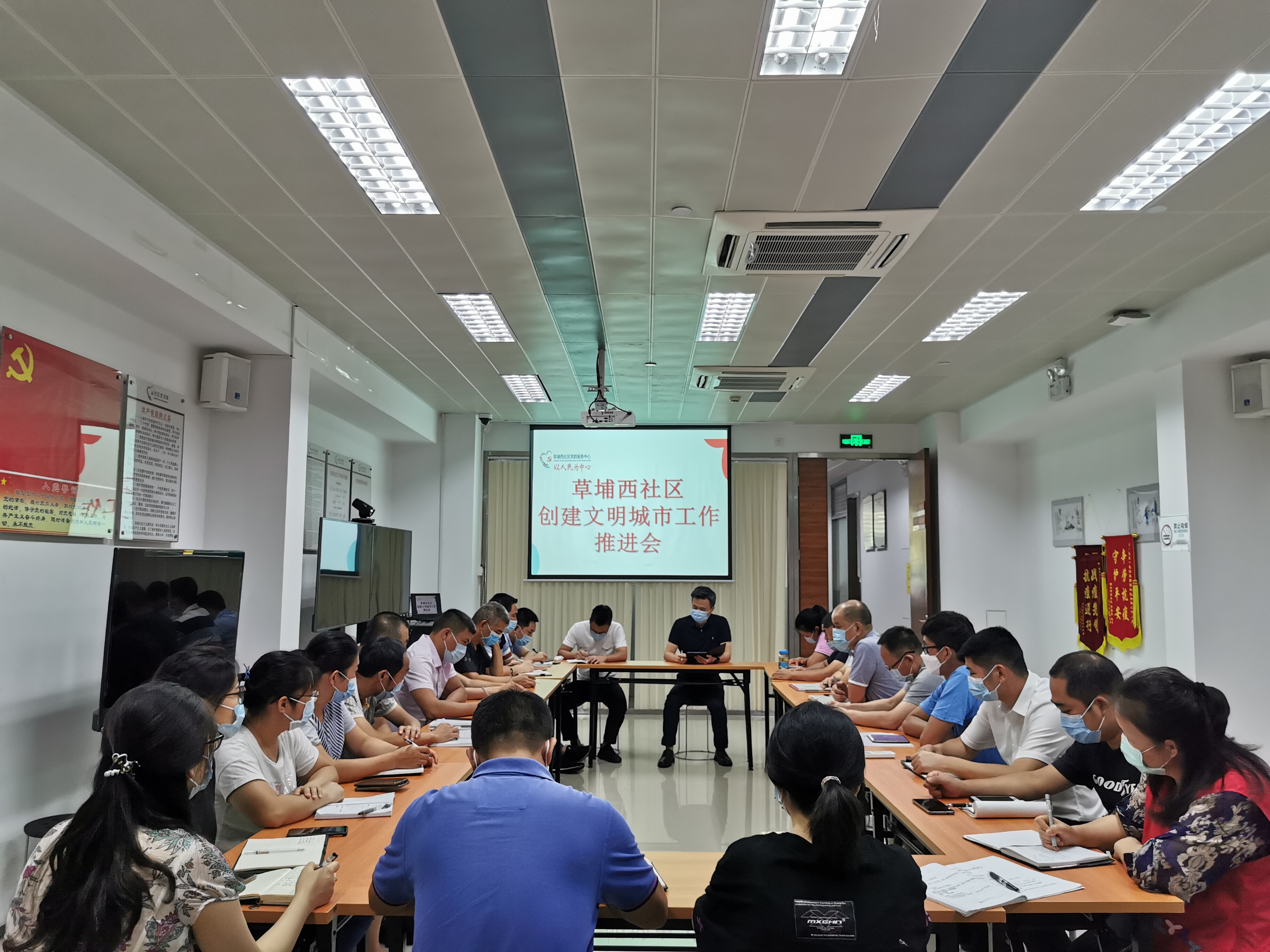 8月27日下午,草埔西社区党委召开草埔西社区创建文明城市工作推进会。会议由草埔西社区党委书记邓新锋主持,社区全体工作人员参加。邓书记在会上对创文工作进行再部署再落实,要求全体工作人员务必重视,继续做好创文入户宣传工作、安全巡查工作结合创文宣传,加强日常巡查,特别是针对非机动车乱摆放问题,要及时发现、制止和纠正,扎实做好创文工作。
