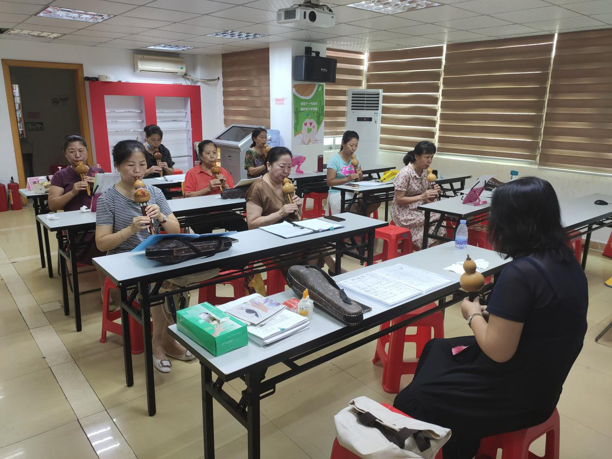 9月4日上午,草埔西社区葫芦丝队开展常规练习活动,本次活动进行的是新曲目《有一个美丽的地方》的学习。老师先给大家进行吹奏示范,然后指出这一首曲目的学习重点,针对重点节段带领大家进行多次的练习,现场学员认真学习。