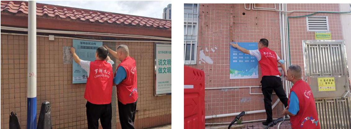 9月14日下午,草埔西社区工作人员按照街道指示,把pvc硬板海报张贴在本社区重点和显眼的户外区域。