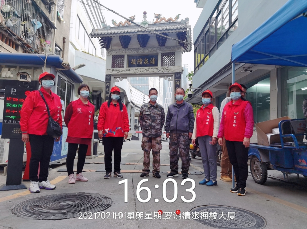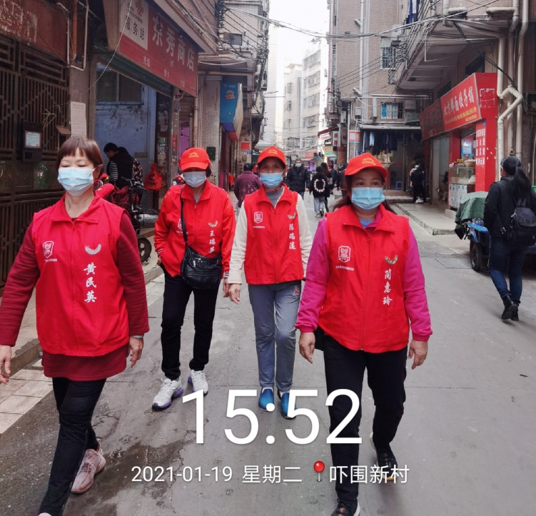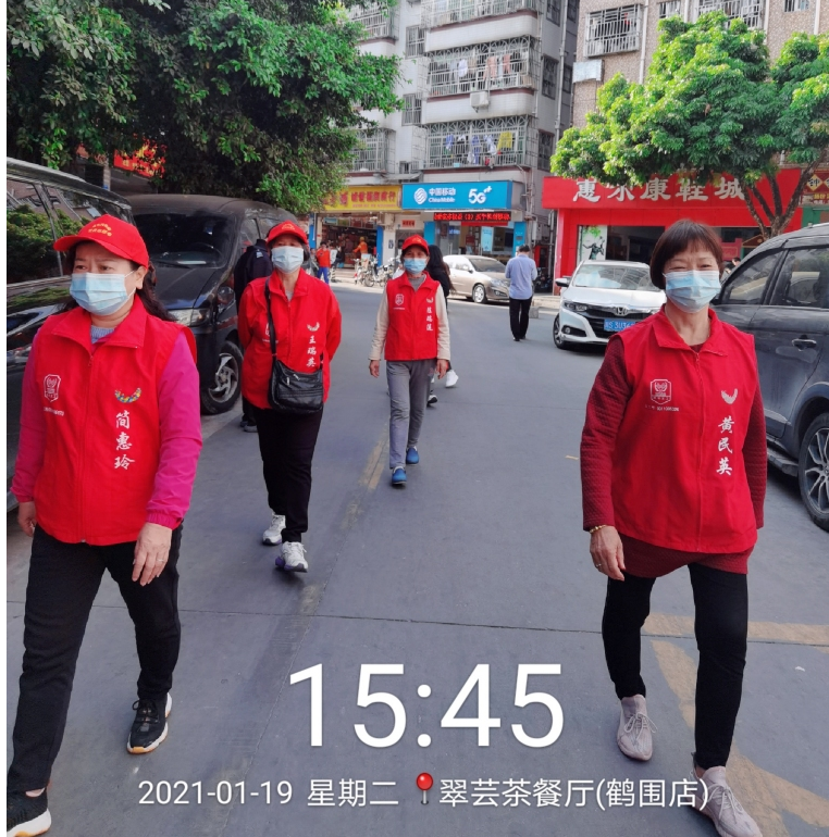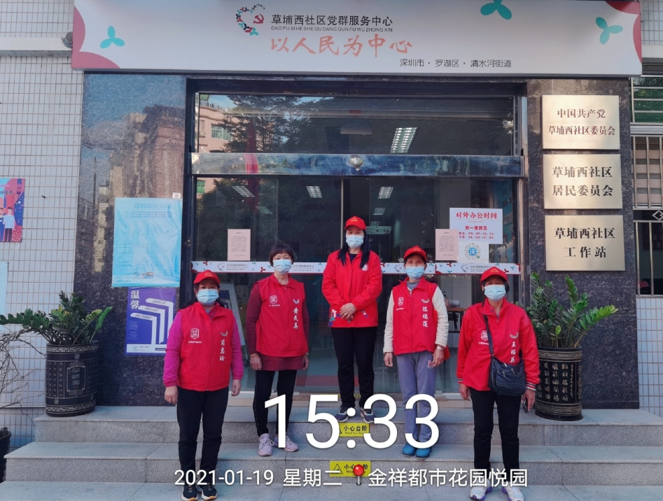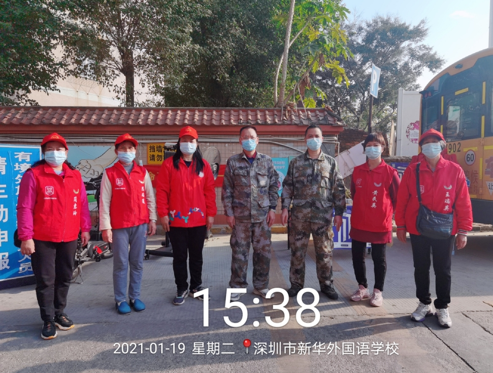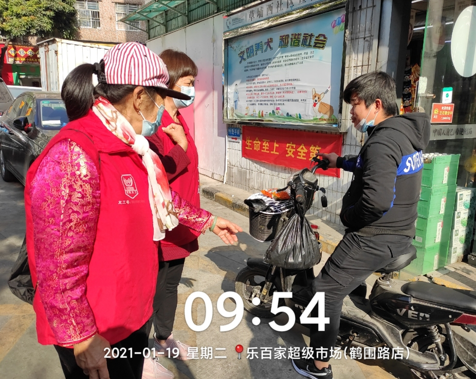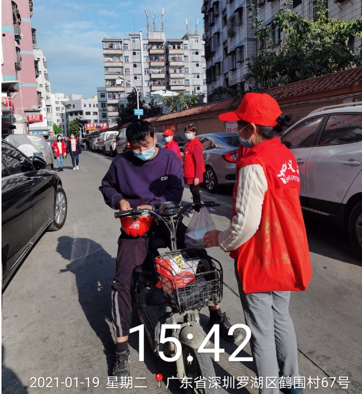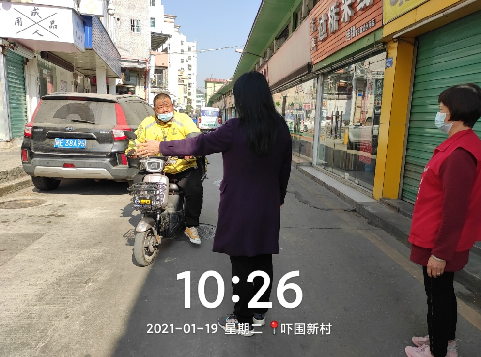 2021年1月19日,草埔西社区老协志愿者助力”一盔一戴”宣传劝导工作,并给居民派发留深过年倡议书。