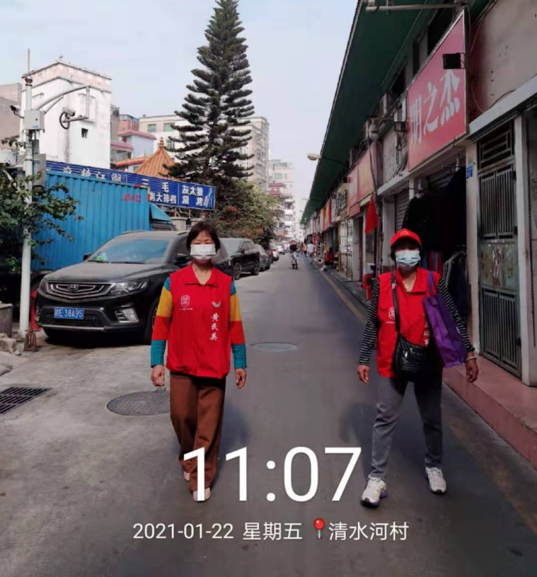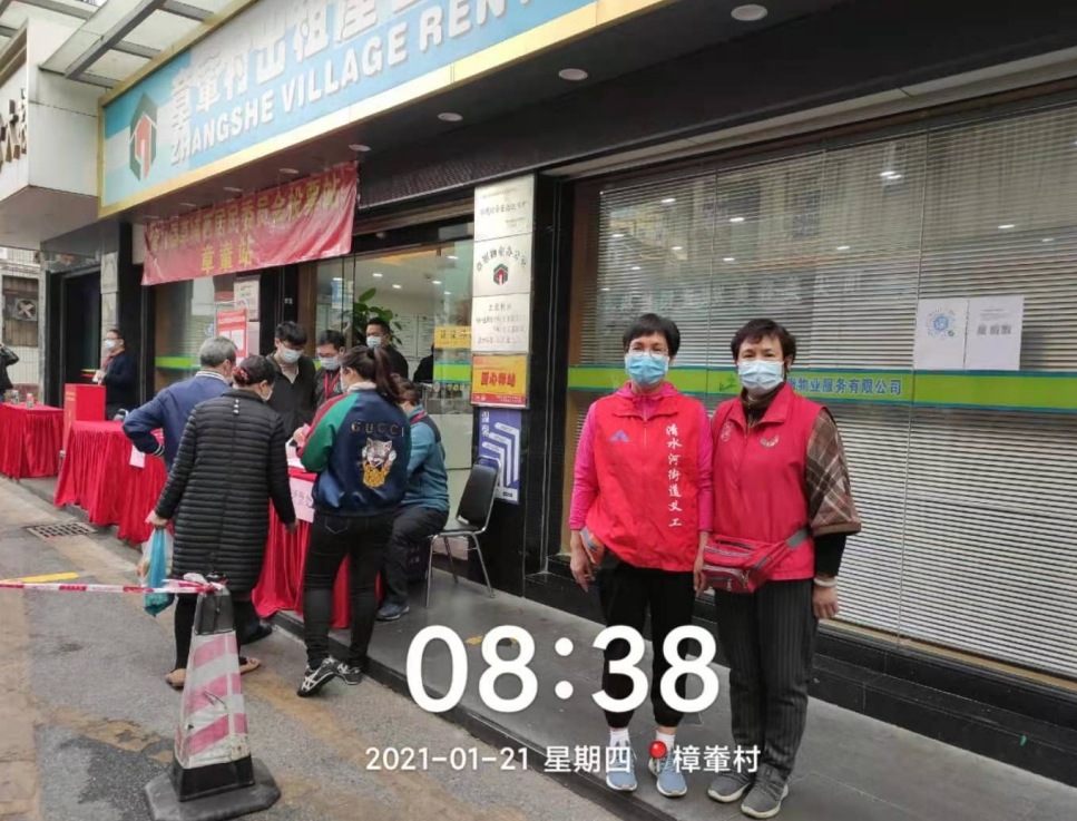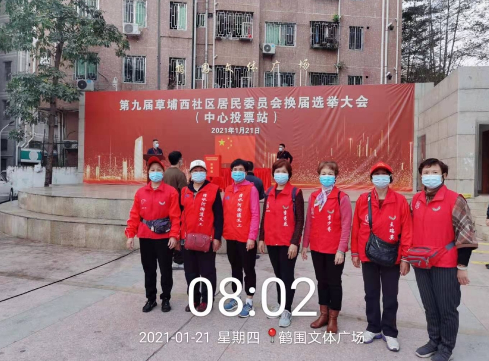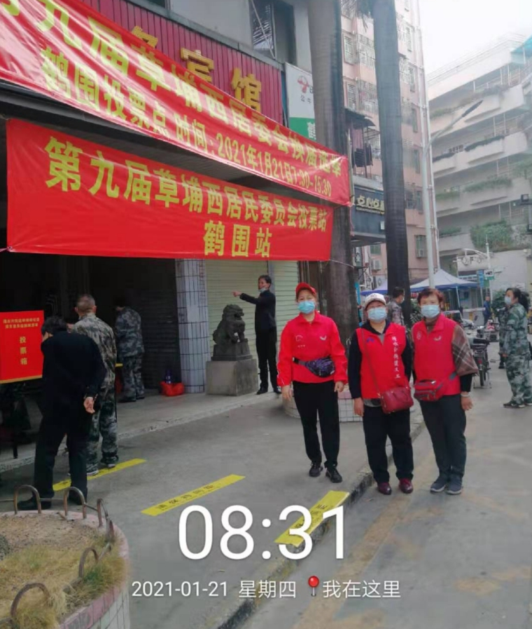 2021年1月21日,第九届草埔西社区居民委员会换届选举日,草埔西社区党委组织老协志愿者进行引导选民到投票站投票。