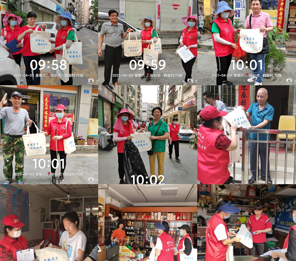 2021年4月3日,草埔西社区志愿者参加第33个爱国卫生月宣传活动,开展村容村貌大清扫,沿街发放环保袋、防蚊、防鼠、防蟑螂宣传活动。