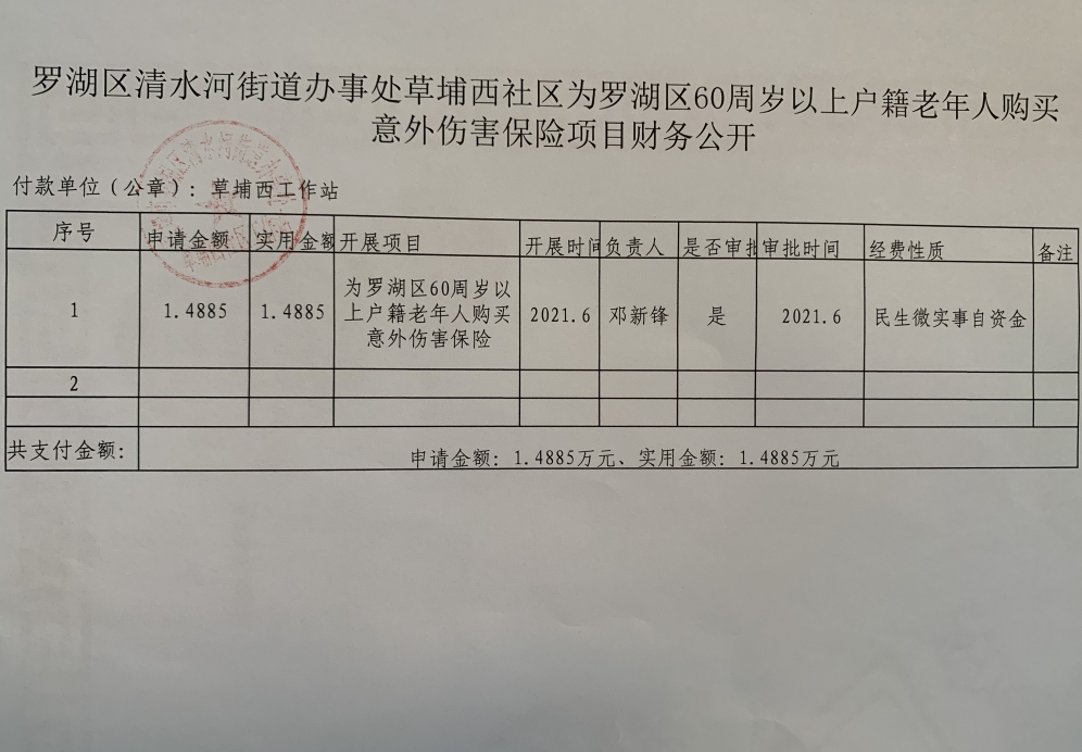 清水河街道草埔西社区民生微实事服务类项目财务公示表