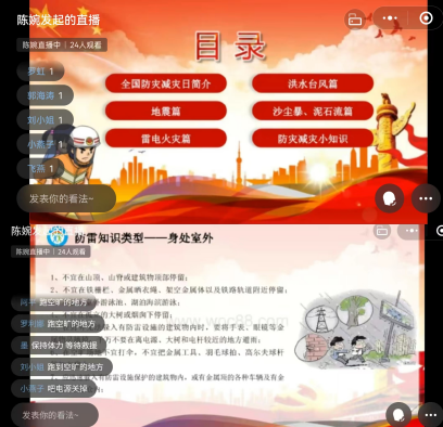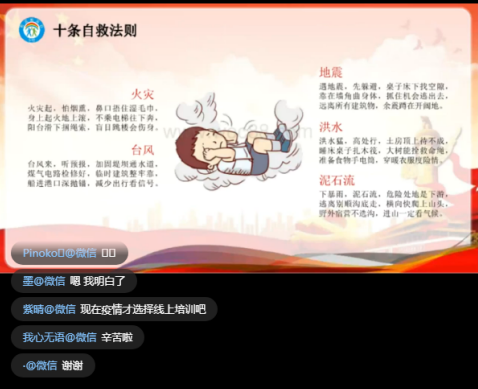 本次活动有二十多名志愿者参加 ,以线上形式进行,社工围绕地震篇、雷电火灾篇、洪水台风篇、沙尘暴、泥石流篇以及防灾减灾小知识内容宣讲。地震时该怎么做,首先,在重心较低、且结实牢固的桌子下面躲避,并紧紧抓牢桌子腿;在没有桌子等可供藏身的场合,无论如何,也要用坐垫等物保护好头部等相关知识。志愿者们与社工进行知识问答,互动参与感十足。