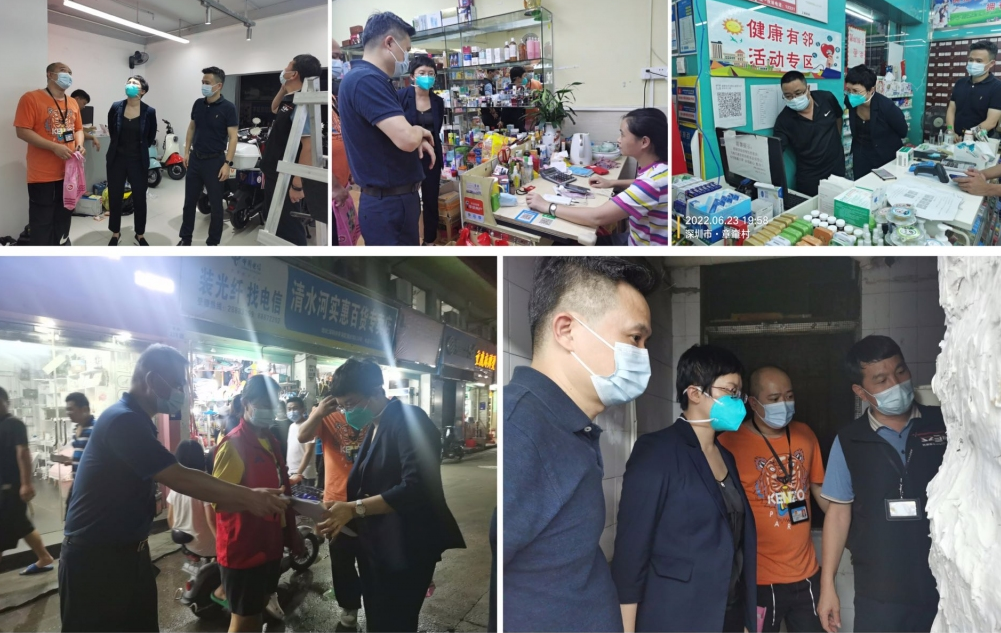 6月23日晚,街道办事处宫雪主任带队街道综合应急办等人到草埔西社区商业街门店开展安全巡查及核酸检测检查行动,草埔西社区党委书记邓新锋、副书记蔡莉珊及安全专干等人陪同检查。