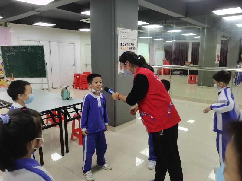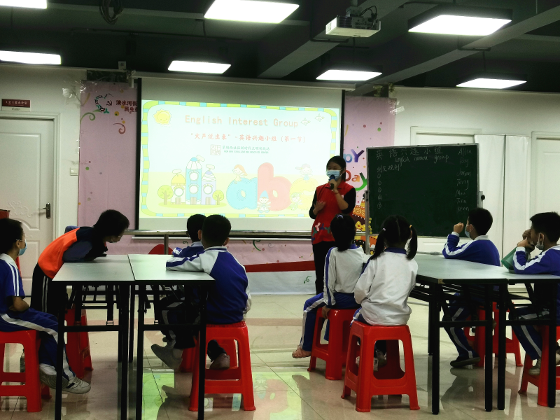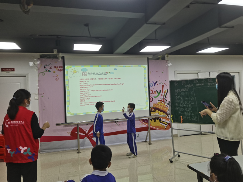 本次小组活动分为六节,分别是自我介绍和打招呼、介绍自己的家人、自己的身体、在教室、在动物园、在农场等主题。11月4日晚上午社工在活动室开展第一节英语兴趣小组活动。活动开始,志愿者让小朋友两两分组进行“运气球”游戏来培养他们的默契。随后,社工通过趣味游戏让同学们运用提前取的英文名,逐一做自我介绍。大家热情参与,表现积极。为增强组员们自我管理和自我约束,社工指导组员们一起订立“小组契约”,大家议论纷纷,活动室里充满热烈的讨论声,小组契约制定完成后,组员们签下自己的名字。活动中期,社工通过播放打招呼的动画视频,教组员们学习新的词语和句型。大家学得很认真,对社工提出的问题,踊跃举手发言。之后,社工给每个人发放《英语单词有声书》,并告知使用方法。大家都迫不及待跟着读起来。活动最后,社工让4个小组依次上台情景模拟打招呼的句型,并布置家庭作业让他们给家人做自我介绍。另外,提前告知下节小组活动的主要内容。