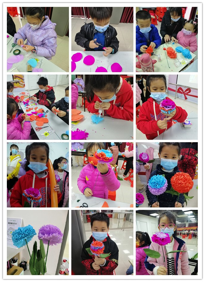 活动第一阶段,社工带领同学们一起玩“筷子夹弹珠”,“投球”和“词语接龙”等游戏,活动室处处洋溢着孩子们的欢笑声。通过这些游戏,调动孩子们的积极性和主动性,集中孩子们的注意力,活跃团体气氛。游戏过程中锻炼了孩子们的反应能力,培养了孩子们之间的默契,从视知觉和听知觉大大提升孩子们的专注力。活动第二阶段,社工通过PPT和视频向同学们介绍褶皱纸工艺,同时详细讲解制作永生花的步骤。同学们拿到手工材料后,迫不及待做起来。在社工和志愿者的协助下,一朵朵漂亮的永生花完成。同学们拿着亲手制作的花朵,非常开心,纷纷表示要送给自己的爸爸妈妈,在寒冷的冬天,让花朵带着孩子美好的祝福温暖亲爱的父母。