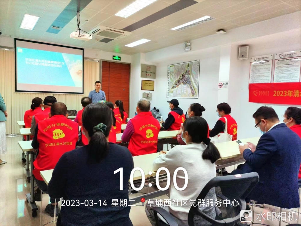 2023年3月14日上午,清水河街道草埔西社区在社区工作站开展“书记垃圾分类培训及宣传”活动,活动由草埔西社区书记主持,蒲公英讲师进行培训,旨在提高社区督导员的垃圾分类水平,推进垃圾分类工作。会上、社区书记介绍了整个社区垃圾分类的目标和存在的问题,督导员们积极发言,提出各种各样的问题,蒲公英讲师给予了详尽的解答,使参加培训的督导员们更加明确、全面地了解了垃圾分类工作的重要性和具体实施方法。会议结束后,所有参加者一起合影留念,并由社区专干叶干事带领每个村的督导员,前往各村的餐饮店、果蔬店等商业区,进行餐厨垃圾分类宣传活动。督导员们通过张贴海报、发放宣传单,向商家和居民宣传分类知识,倡导环保理念,得到广大市民的积极响应。