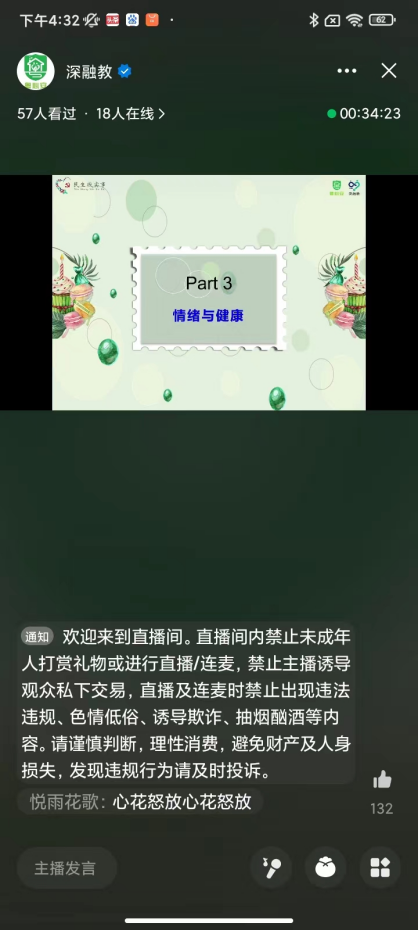 活动伊始,主讲老师赖晓燕通过一段简单轻快的拍打训练带领屏幕前16位青少年放松身心,进入愉悦放松的学习氛围。从识别情绪的四大类型喜、怒、哀、惧,引出情绪的具体概述,所谓情绪就是人对客观事物的态度体验,它反映的是客观事物与人的需要之间的关系,并且表现为喜、怒、哀、惧等特殊的内心体验。认识完什么是情绪后,赖老师引导线上16位青少年进行体验不同情境下情绪产生和变化的原因,人的需要是否得到满足,是情绪产生变化的一个重要原因。当人的需要得到一定的满足时,就会产生积极情绪,当人的需要得不到满足或事与愿违时,就会产生消极情绪,16位青少年在直播评论区里纷纷发表感悟,表示生活中经常有无法控制自己情绪的场景出现,会觉得这样不好,听了老师的课后认识到了每一种情绪都是正常的以及学会了正视自己的需求从而才能更好地控制情绪。