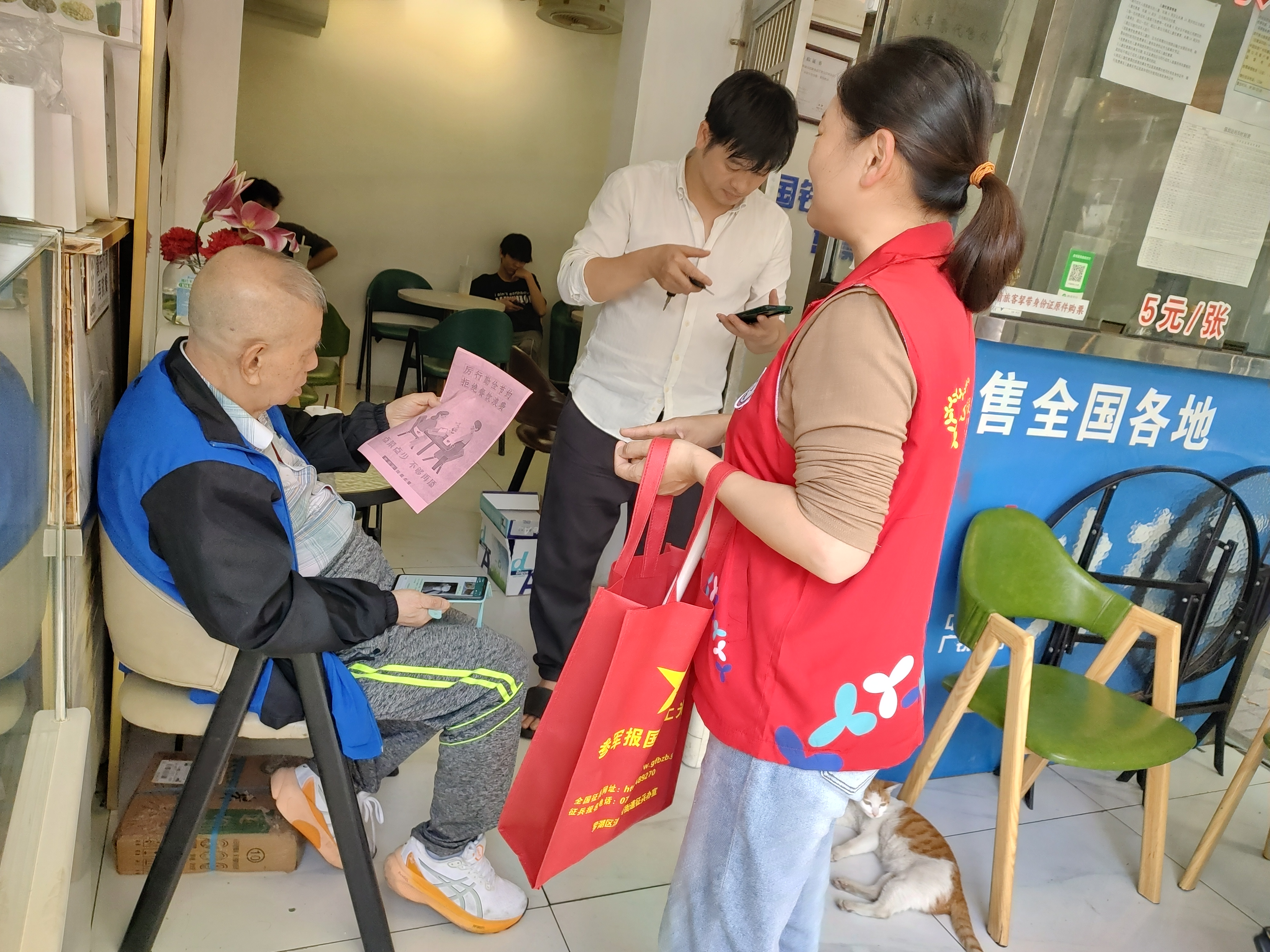 活动中,志愿者向居民派发"厉行节约,反对浪费"的宣传单张,引导群众增强反餐饮浪费意识,养成文明健康餐饮消费习惯。