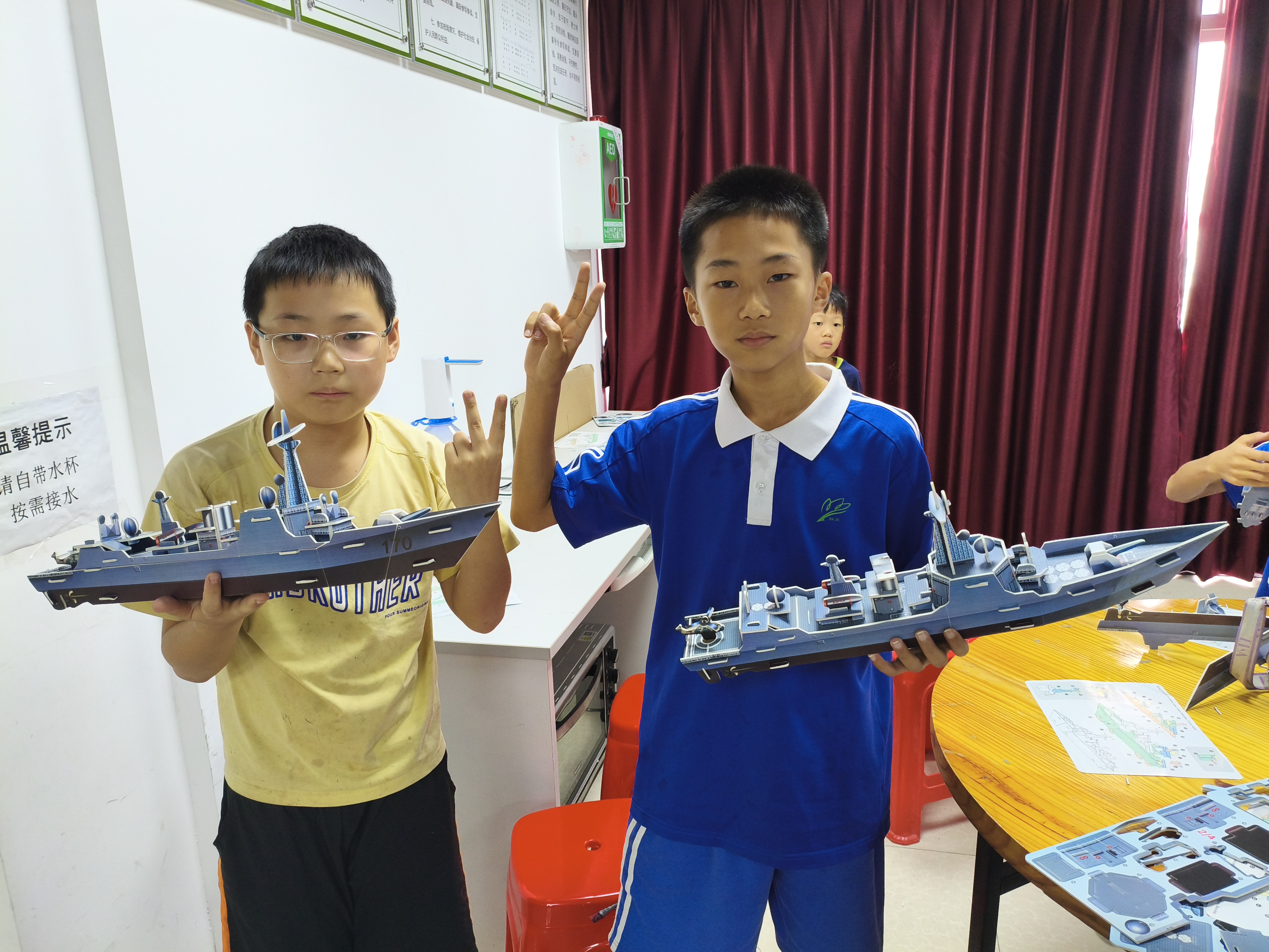 本次活动的主题是船舶。老师为大家讲解了我国军民领域船舶工业的巨大发展,介绍了一些船舶领域的大国工程;接下来老师为大家分发手工套装,带领学生们一起动手组装制作,在动手制作中认识和学习军用船舶的基础知识,在大家的认真组装和老师的指导下,一艘艘军用驱逐舰模型手工作品做好了,大家通过军舰模型学习海军船舶的知识,感到十分惊喜与满意。