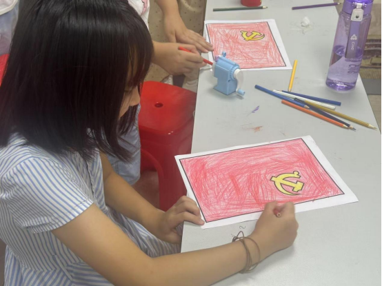 接着,进入涂色画手工环节。社工向孩子们展示了党旗的图案,讲解了党旗的构成元素及象征意义。在社工的指导下,孩子们迫不及待地拿起手中的彩笔和画纸,开始认真制作。经过大家努力,一幅幅色彩鲜艳的党旗完成了。孩子们看着自己的作品,脸上洋溢着自豪的笑容,纷纷表示要将作品带回家,向家人讲述党旗的故事。