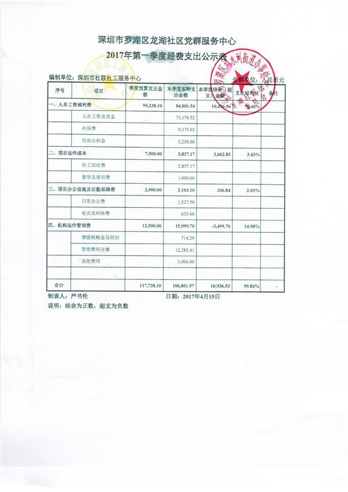 2017年龙湖社区党群服务中心第一季度经费支出公示