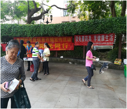 为提升民众信息保密意识,增强学习反诈骗知识与技能。2019年8月12日下午龙湖社区工作站在龙园山庄组织开展“反信息诈骗”宣传活动。