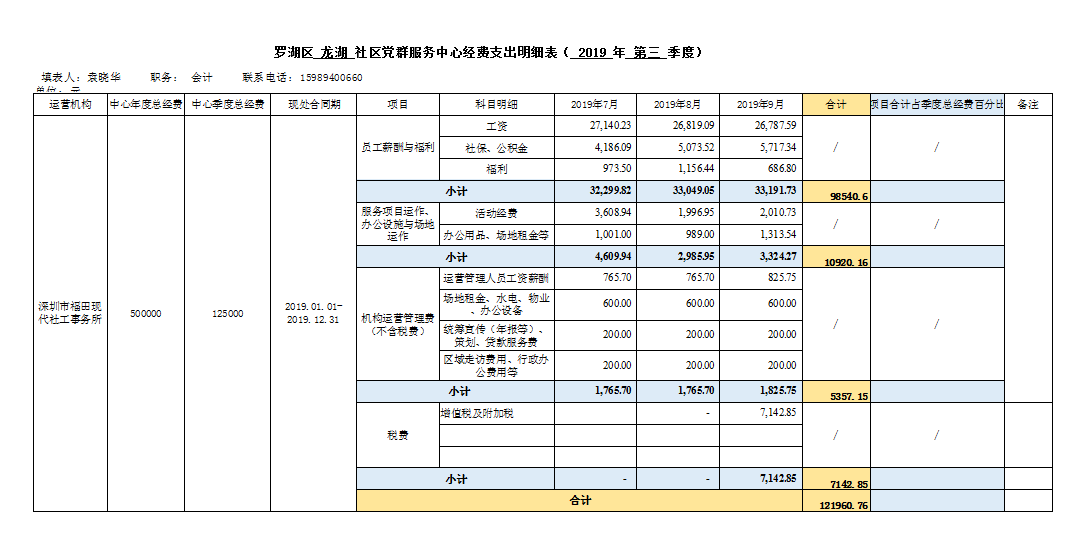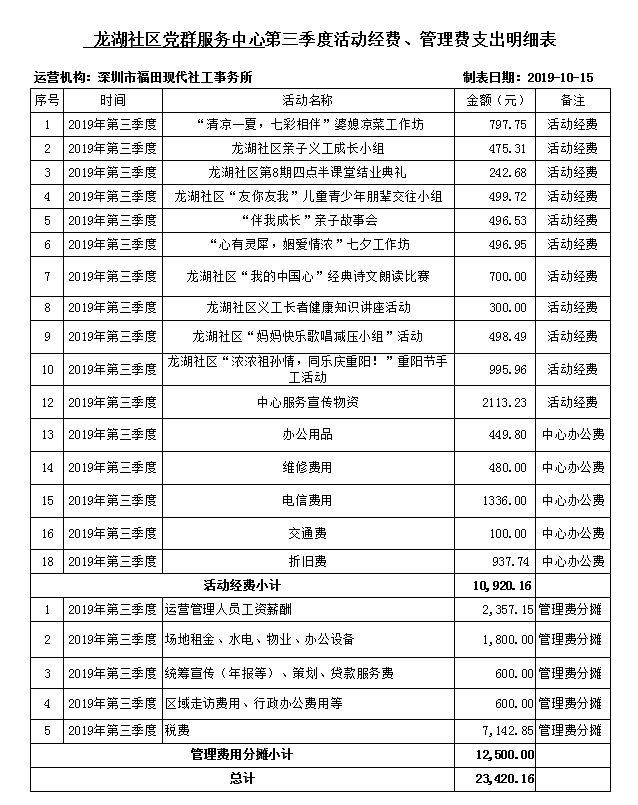 龙湖社区党群服务中心政府购买项目——第三季度经费支出明细