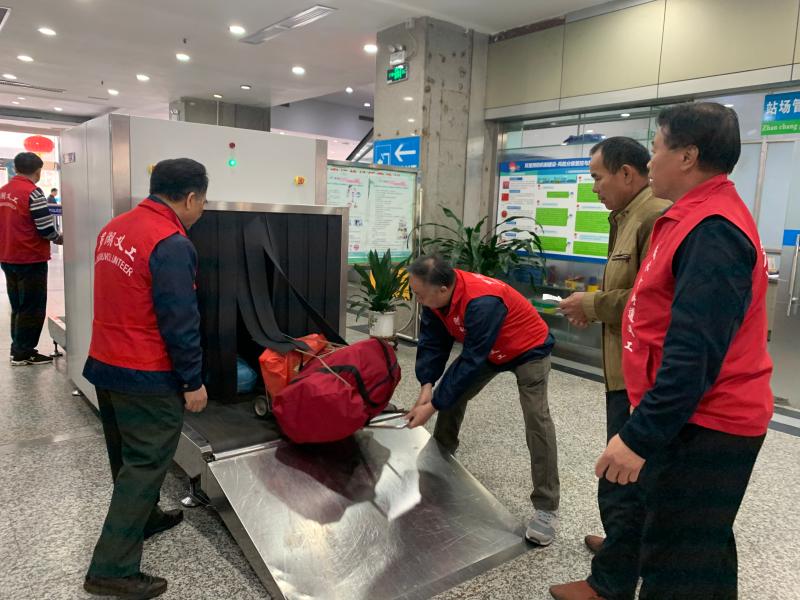 义工们分为上下午服务组,义工和社工们来到了汽车站,分工合作。有的在服务台提供咨询服务,有的在检票口协助检票,有的在安检机前后协助旅客箱包过安检,有的在电子取票机前耐心的指引不会的旅客进行取票操作。