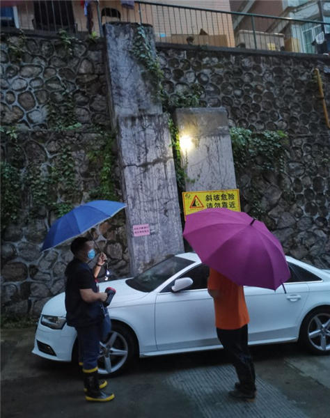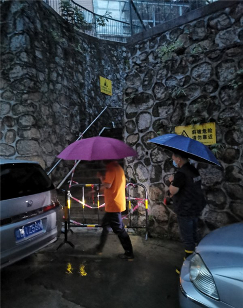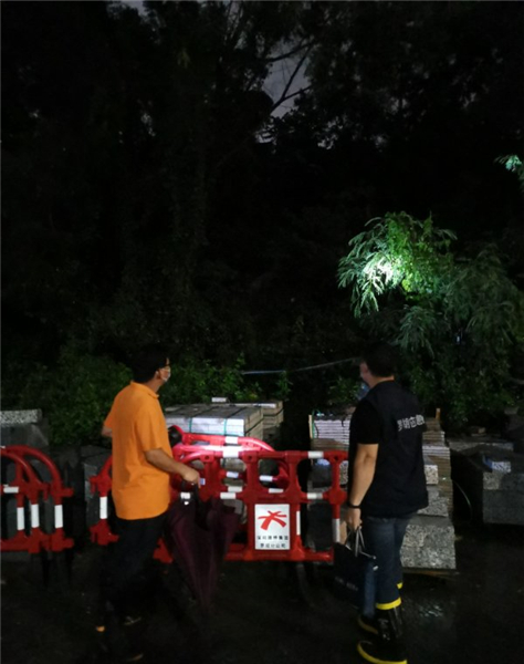 当晚,巡查人员提前排查安全隐患,对重点区域拉设警戒线,防止出现人员伤亡。随着降雨量增大,值班人员对辖区边坡围墙及水浸灾害隐患点开展巡查排查,同时加强低洼地带易涝点的巡查力度,对辖区内的排水井盖进行实地查看,确保雨水顺利下排,最大限度避免内涝的产生,确保暴雨天气无隐患、无事故。