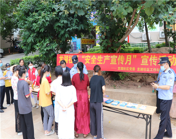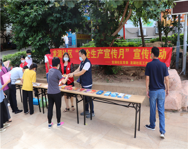 为消除事故隐患,筑牢安全防线,2020年6月30日下午,龙湖社区党委组织辖区各物业管理处及“三小”场所从业人员开展“安全生产月”宣传活动。