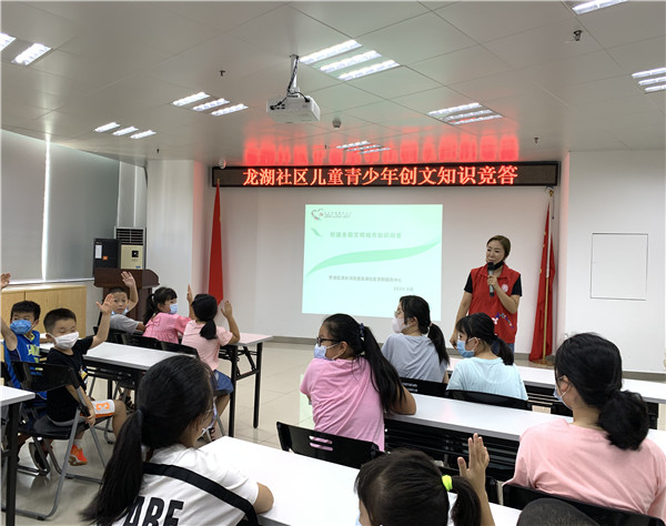 近日来,深圳市创建文明城市工作已全面铺开,如何积极引导儿童青少年群体参与到创建文明城市中来,将“创文”精神深深扎根、发展、夯牢?龙湖社区党委充分发挥党建引领作用,开展了一系列儿童青少年创文活动,7日下午,龙湖社区党群服务中心活动室里30多位儿童青少年正争先恐后回答“创文”知识。