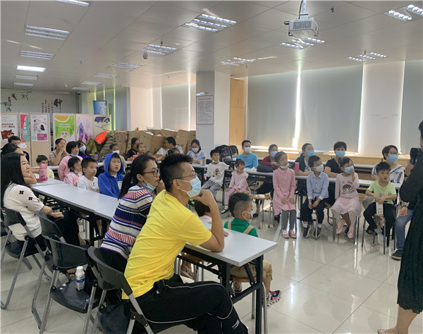 本场活动特别邀请到了深圳市龙岗区优秀语文教师--黎洁,为社区居民分享了有趣的儿童故事以及家长怎样引导孩子爱上阅读。活动开场,社工带领大家玩了“拍手歌”热身游戏,小朋友跟着社工的歌声整齐的拍手、跺脚,现场气氛十分活跃。