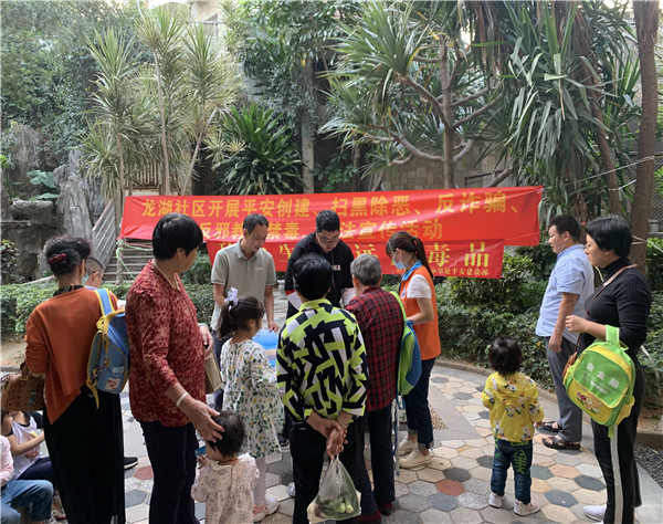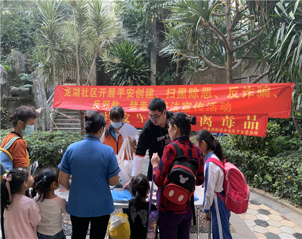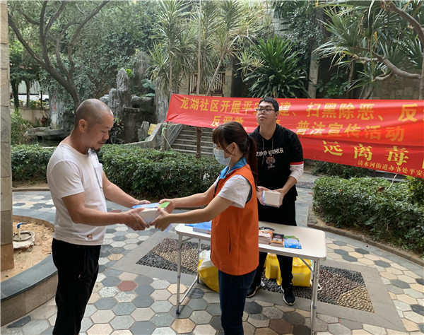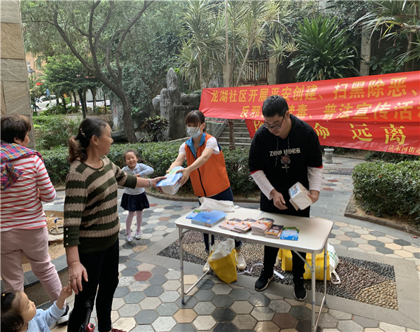 为进一步加强扫黑除恶专项斗争、禁毒宣传工作。11月5日下午,龙湖社区党委组织网格员、禁毒社工在龙园山庄33栋架空层开展“扫黑除恶、反恐反邪反诈骗、禁毒、普法、平安社区”宣传活动。
